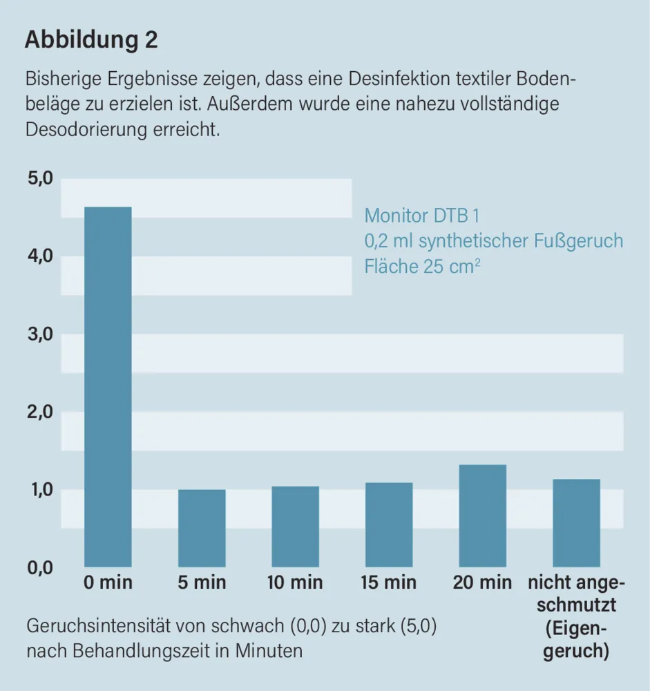 In bisherigen Ergebnissen konnte gezeigt werden, dass unter Einhaltung optimaler Prozess- und Plasmaparameter eine Desinfektiontextiler Bodenbeläge zu erzielen ist. Außerdem wurde eine nahezu vollständige Desodorierung (Abbildung 2) erzielt, wobei für die Untersuchungen verschiedene Lebensmittelgerüche und synthetischer Fußgeruch als Anschmutzungen eingesetzt wurden.