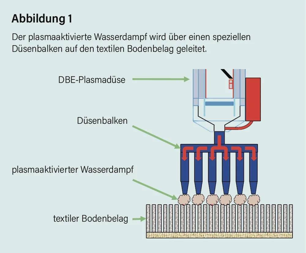 Der plasmaaktivierte Wasserdampf wird anschließend über einen speziellen Düsenbalken gezielt auf den textilen Bodenbelag geleitet (Abbildung 1) und wirkt dort in hohem Maße keimreduzierend und desodorierend. Ferner unterstützt der plasmaaktivierte Wasserdampf die Schmutzentfernung, indem durch Angriff der Hydroxylradikale an Schmutzkomponenten deren Wasserlöslichkeit erhöht wird. Dies erleichtert die Schmutzentfernung durch Absaugen sowie die Detachur mit Wasser beziehungsweise wässrigen Reinigungslösungen.