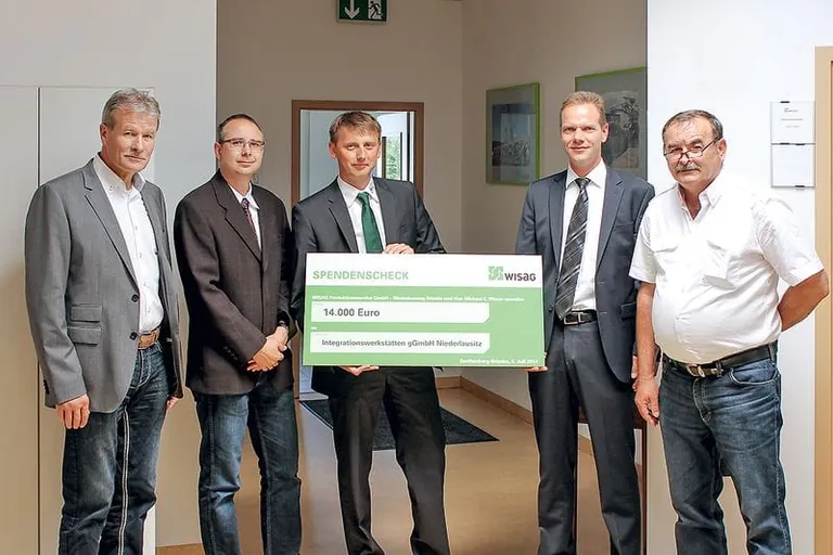 Seit 1991 ermöglicht die Werkstatt für Behinderte in Senftenberg behinderten Menschen angemessene Arbeits- und Lebensbedingungen und bietet diesen damit eine Chance auf Integration. Nun wird das Unternehmen von der Wisag Industrie Service Holding unterstützt. Unbrauchbarer Kern- und Mischschrott von alten Stahlträgern und Lokomotiven der Wisag Produktionsservice GmbH, Niederlassung Brieske, wurde von Mitarbeitern vor Ort gesammelt und von einem Schrotthändler pro Tonne angekauft. So konnte ein Spendenscheck von über 14.000 Euro überreicht werden. Die Hälfte der Gesamtsumme spendete Michael C. Wisser, Vorsitzender der Geschäftsführung der Wisag Industrie Service Holding.