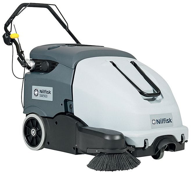 Die neue Mitgänger-Kehrmaschine SW900 von Nilfisk professional ist mit einer Hauptkehrwalze von 60 cm Breite für kleine bis mittlere Flächen ausgelegt und wahlweise mit Benzin- oder Batterieantrieb ausgestattet. Hinzu kommen ein oder zwei Seitenbesen (serienmäßig rechts, optional links), wodurch sich die Arbeitsbreite von 82 auf insgesamt 105 cm erhöht. Die theoretische Flächenleistung wird mit 3.715–4.725 m²/h angegeben. Das neu konzipierte Schmutzbehältersystem mit integrierten Rädern und Bügelgriff garantiert die schnelle Entnahme des 60 l fassenden Kehrgutbehälters sowie dessen komfortablen Transport zum Entsorgungsort. Der 1,9 m² große Hauptfilter verfügt über einen elektrischen Filterrüttler. Das patentierte One-Touch-Kehren stellt den gleichzeitigen Start von Kehrwalze und Absaugung sicher und vermeidet unerwünschte Staubentwicklung. Dank nicht markierender Reifen und Schürzen (optional) eignet sich der Mitgänger sowohl für Hartböden als auch für Teppiche oder sensible Beläge. Der Handgriff lässt sich individuell an die Körpergröße des Anwenders anpassen und für die platzsparende Aufbewahrung vollständig umklappen. Das Einstellen der Kehrwalze sowie der Austausch von Walze, Seitenbesen und Staubfilter gehen werkzeugfrei von der Hand.