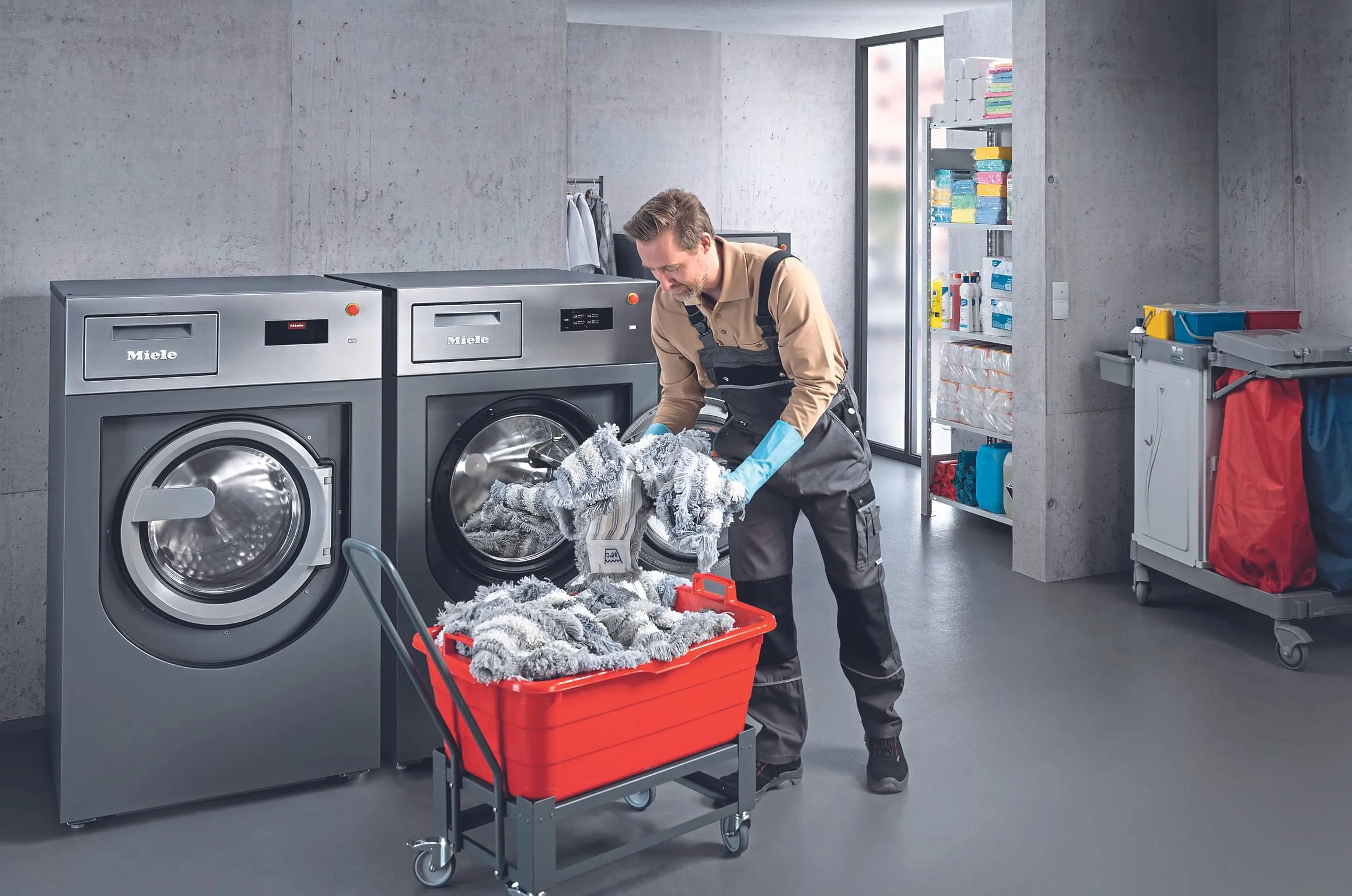 Für eine sichere und einwandfreie Aufbereitung von Reinigungstextilien sollten daher stets professionelle Waschmaschinen eingesetzt werden. Sie sind auf häufige Benutzung, hohe Schmutzfrachten und kurze Bearbeitungszeiten ausgelegt. Sie werden hygienischen Anforderungen gerecht und sehen den Anschluss einer Dosieranlage vor. Moppwaschmaschinen berücksichtigen außerdem die verfahrenstechnischen Besonderheiten, die beim Waschen von Wischbezügen gelten. Dazu gehören unter anderem das Vorspülen, ein hohes Flottenverhältnis und die Einhaltung von Temperatur- und Zeitparametern beim desinfizierenden Waschen.