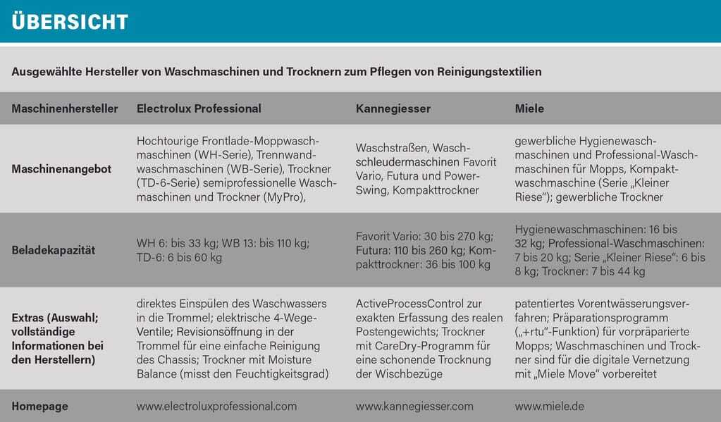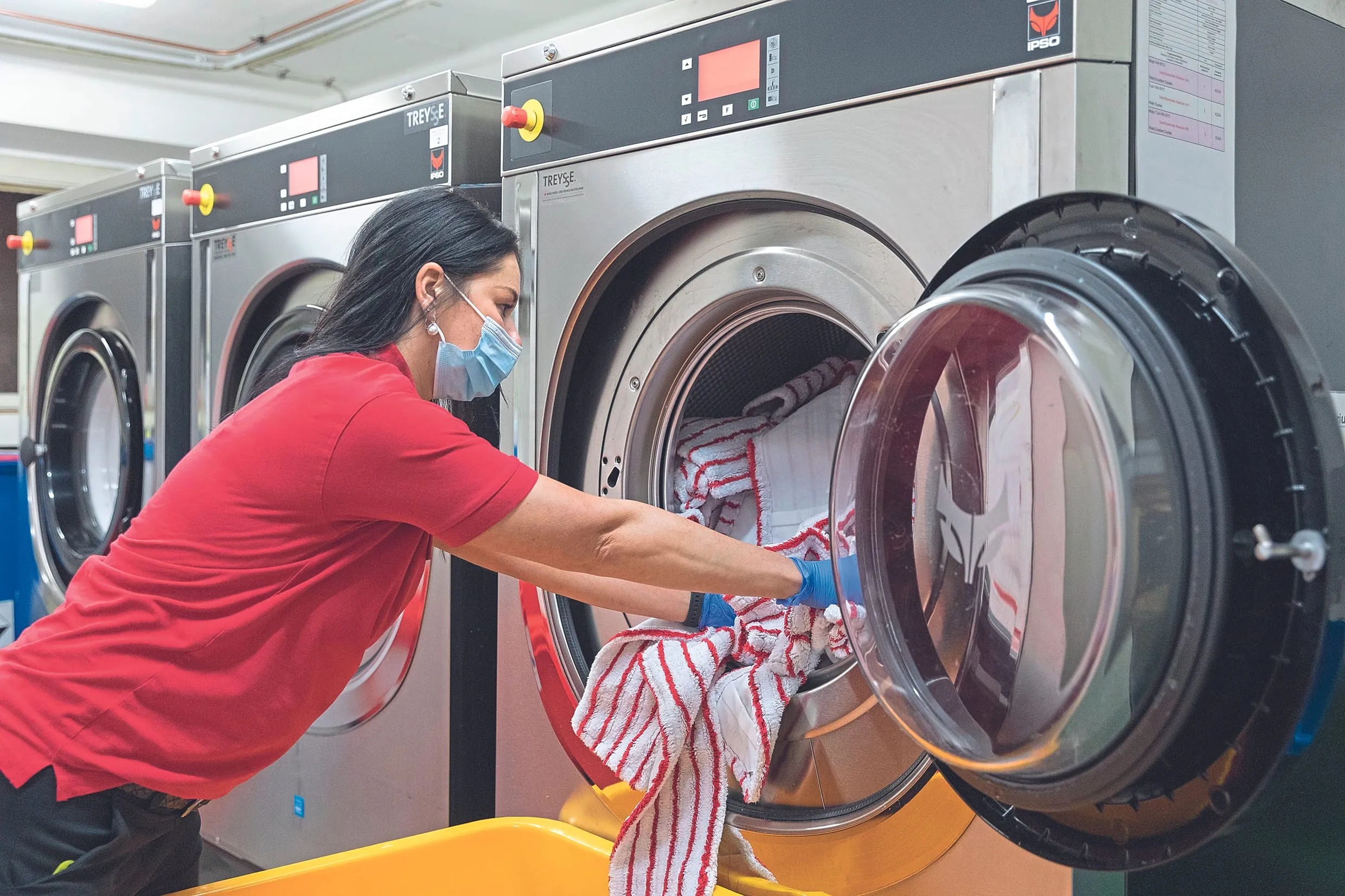 Die Entscheidung eines Gebäudereinigers, im Objekt zu waschen oder eine zentrale Wäscherei zu betreiben, entscheidet über die maschinelle Ausstattung. Grundsätzlich gilt, dass die Waschmaschinen und die Trockner aufeinander abgestimmt sein müssen. Ein zu klein gewählter Trockner kann schnell zum Nadelöhr werden, weil er das fertig gewaschene Textilvolumen nicht bewältigen kann. Größe und Art der Maschinen richten sich nach der anfallenden Menge und der Art und Materialzusammensetzung der Textilien, den anfallenden Verschmutzungen sowie geltende Regularien, zum Beispiel an eine desinfizierende Aufbereitung. Darüber hinaus müssen die räumlichen und technischen Gegebenheiten berücksichtigt werden. Bei diesem Prozess können Betriebe auf die Unterstützung der Maschinenanbieter und/oder deren Servicepartner bauen. Sie nehmen vor Ort eine Objektanalyse vor, ermitteln den Bedarf und erstellen auf Grundlage der Gegebenheiten eine Empfehlung zur Maschinenauswahl. Dabei kann es vorkommen, dass aufgrund der Arbeitsprozesse von einer größeren Maschine abgeraten und stattdessen die Aufstellung von zwei kleineren empfohlen wird. Außerdem erstellen einige Anbieter eine Wirtschaftlichkeitsberechnung, die unter anderem die individuellen Kosten für Strom und Wasser berücksichtigt.