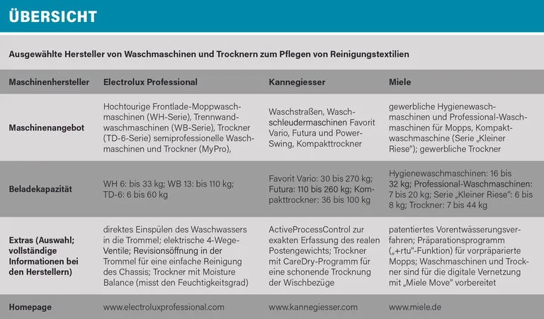 Bei der Aufbereitung von Reinigungstextilien spielen die Waschmaschinen und Trockner eine wesentliche Rolle. Profigeräte sorgen für zuverlässige Schmutzentfernung und schonende Trocknung, wodurch sie zum Erhalt der Flächenleistung von Wischbezügen beitragen. Um optimale Waschergebnisse zu erhalten, haben die Maschinen jedoch einige Besonderheiten. Worauf man beim Kauf achten muss.