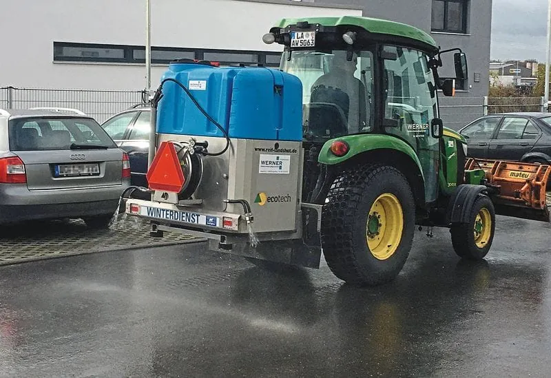 Über je zwei Düsen auf beiden Seiten des zum Winterdienstfahrzeug umfunktionierten Kleintraktors werden die Verkehrsflächen vollflächig benetzt. - © Werner Companies