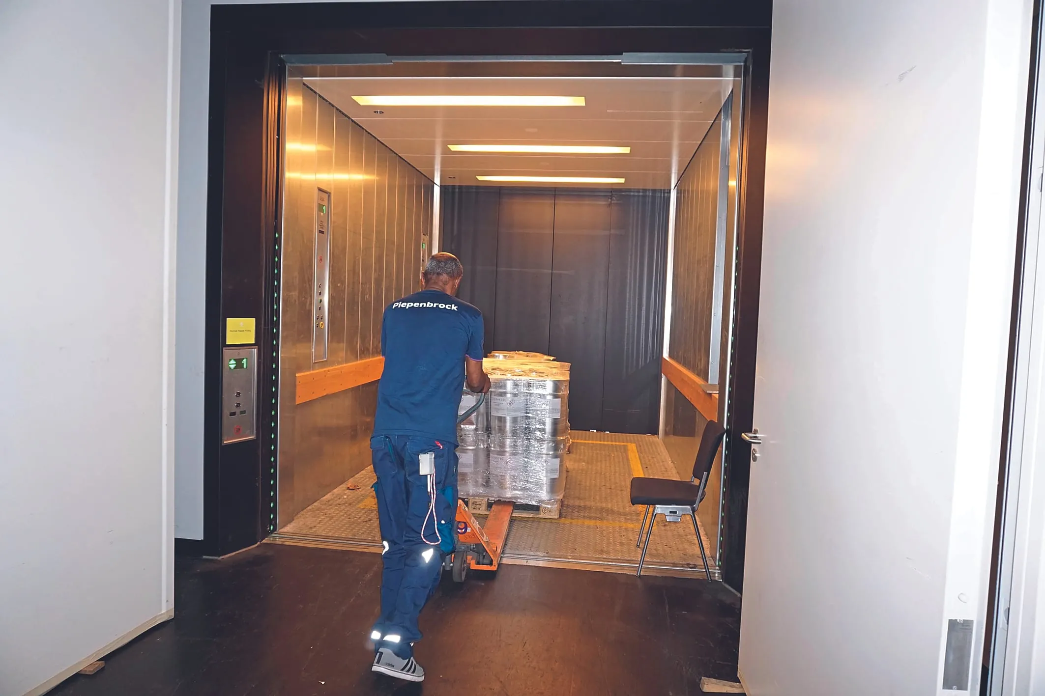 Ein Vorarbeiter und sechs Mitarbeiter des Dienstleisters werteten schließlich den beanspruchten Boden aus Gussasphalt auf. Mit Rat und Tat zur Seite stand ihnen dabei Ludger Bongers von Herwetec. "Für ein einheitliches Ergebnis sollte der Boden vorab gründlich gereinigt werden", betont der Leiter Anwendungstechnik bei dem inhabergeführten Familienunternehmen mit Sitz in Sinsheim. Dementsprechend wurden als Vorbereitung auf den Arbeitseinsatz zunächst Staub und Fett sowie lose Gegenstände wie Klebestreifen und Schrauben entfernt. Anschließend klebten die Piepenbrock-Mitarbeiter Aufzugschienen, Türzargen sowie Ecken und Kanten ab.