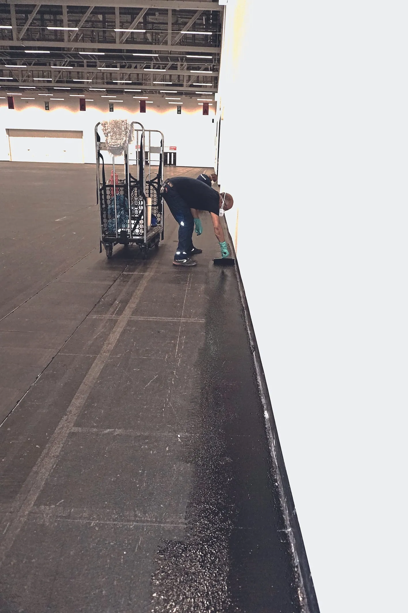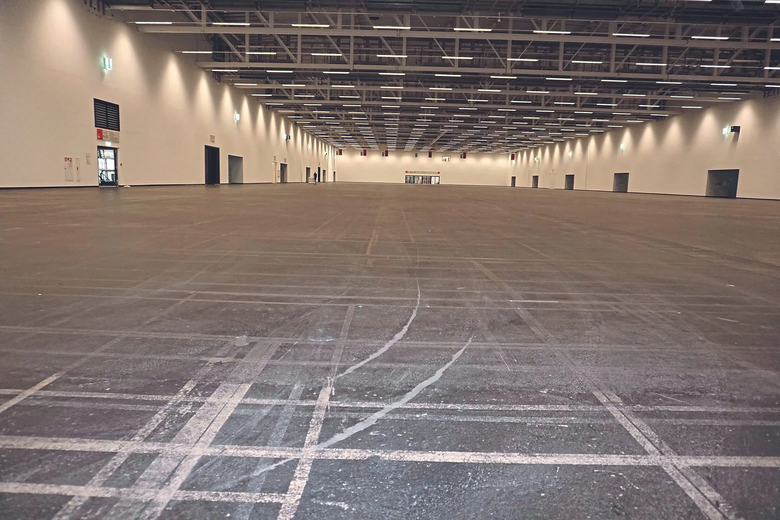 Das rege Treiben in den Hallen, Kongress- und Eventlocations bringt Menschen zusammen, hinterlässt dabei allerdings deutliche Spuren auf den Industrieböden. Besonders beim Auf- und Abbau der Veranstaltungen werden die Flächen stark beansprucht – etwa, wenn ein Stapler eine Palette hinter sich herzieht, ein Bauteil umkippt oder Farbkleckse beim Verschönern des Standes auf dem Boden landen. Entsprechend mitgenommen sah auch der Boden aus Gussasphalt in Halle 5.1 nach einer einjährigen Nutzung aus: Er war gräulich, wies Farbunterschiede und Klebereste von Teppichen auf. Um wieder ein einheitliches Erscheinungsbild zu schaffen und neue Gestaltungsmöglichkeiten zu bekommen, beauftragte die Messe Frankfurt daher ihren langjährigen Partner Piepenbrock mit der semipermanenten Bodenversiegelung.