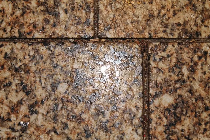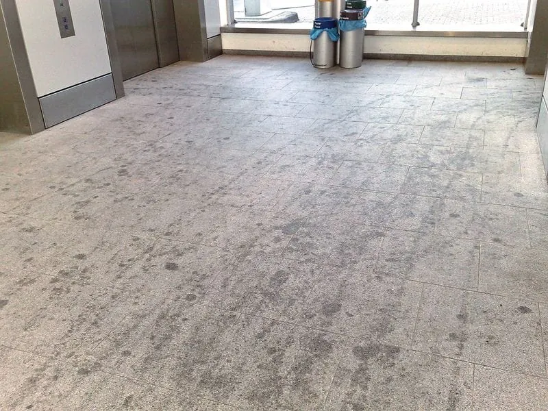 • Abrieb von Sohlen (Ruß aus den Gummisohlen, Lederrückstände, die bei Feuchtigkeit aufquellen und sich in die Oberfläche krallen).