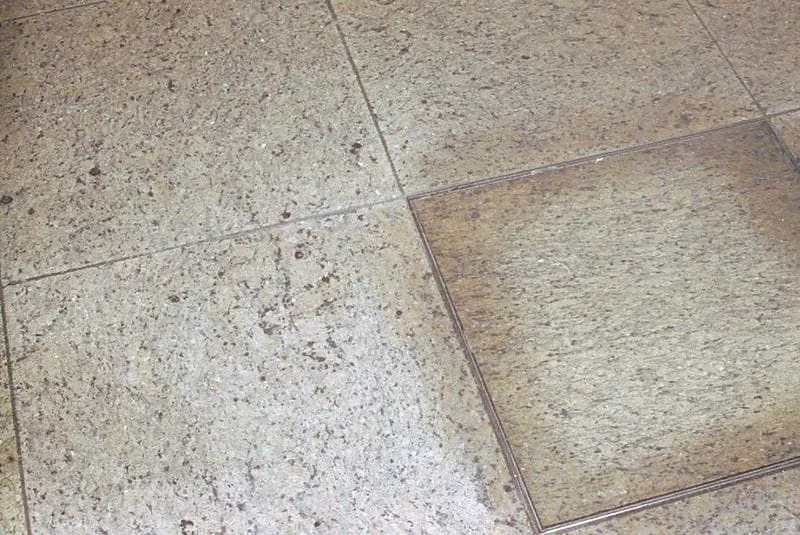 Die eingelegte Platte hatte eine Abdichtung aus einem ölhaltigen Kunststoffschaum. Durch die Reinigung wurde das Öl angelöst und mit Hilfe von Tensiden in den Stein eingebracht.