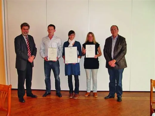 Nadine De-Zolt (Mitte), Bianca Weißer und Viktor Hemminger mit LIV-Geschäftsführer Bernhard Nordhausen (li.) und Landeslehrlingswart Hans-Dieter Kottmeyer (re.).