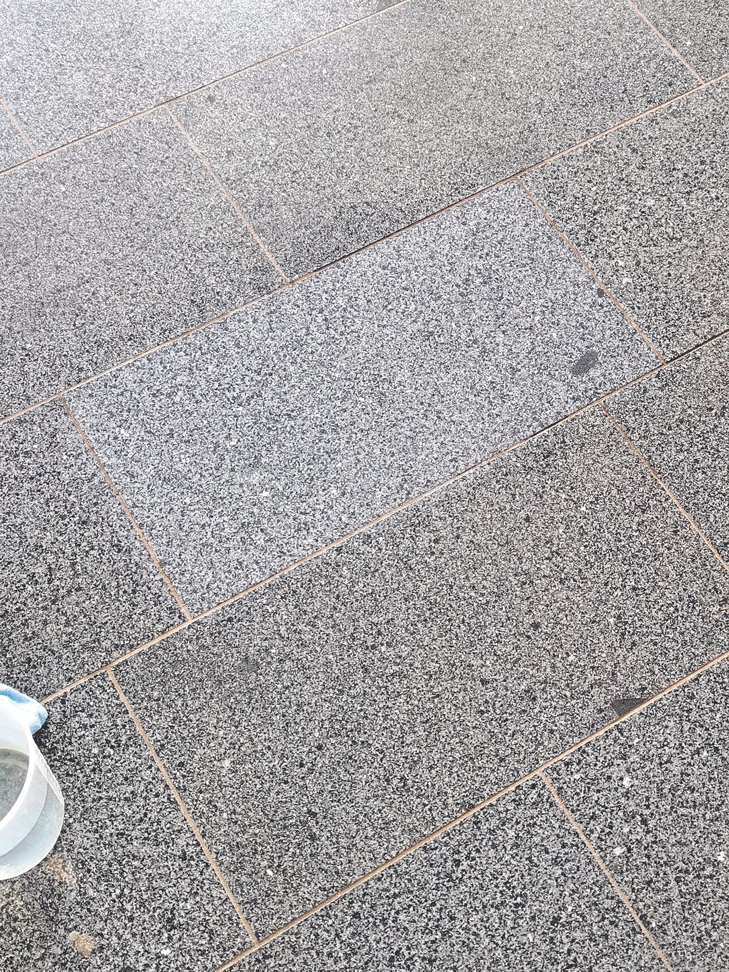 Durch den beschriebenen Reinigungsvorgang konnten die ein­getragenen Verschmutzungen aus der Struktur des Natursteins herausgeholt werden. Auch die gelblich anmutende Verfärbung konnte komplett entfernt werden und die natürliche Farbstruktur des China Impala trat wieder deutlich zutage.
