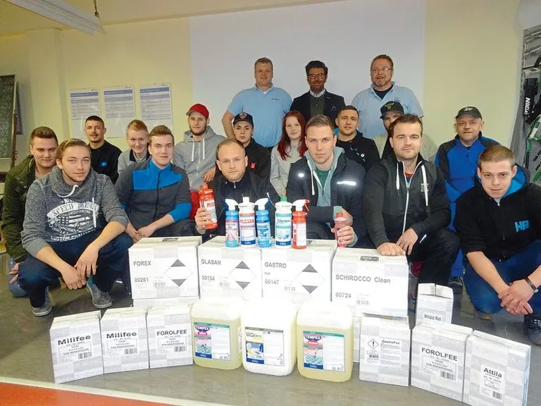 Die Überbetriebliche Lehrwerkstatt (ÜBL) der Gebäudereiniger-Innung Essen, Mülheim, Oberhausen freut sich über neue Reinigungs- und Pflegemittel von Dr. Schnell Chemie.