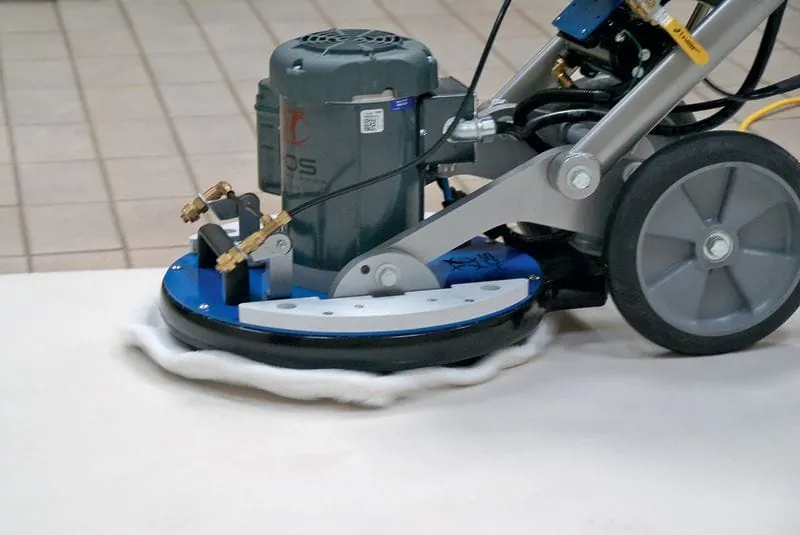 Bereits vor einigen Monaten hatten Jeffrey T. Hruby und Magdalena Riedel die Orbot-Maschine Lehrern und Meisterschülern der Gewerblichen Schule Metzingen vorgeführt. Im Flur vor dem Klassenraum der Meisterklasse liegt ein rötlich brauner Klinkerboden mit einst grauen, nach fast 30 Jahren jedoch anthrazitfarbenen Zementfugen. Jeff T. Hruby, der Entwickler der Maschine, sprühte die Fliesen mit einer Reinigungsmittellösung von Hos ein und fuhr zwei-, dreimal auf und ab. Die Fugen waren nun wieder hellgrau. Der gleiche Versuch auf den Feinsteinzeugfliesen im Nebengebäude, auf den Nadelvliesteppichen im Klassenzimmer mit einem speziellen Teppichpad sowie das Kristallisieren von Betonwerkstein und das Entschichten eines dreifach beschichteten PVC-Bodens überzeugten die Lehrer und Meisterschüler.