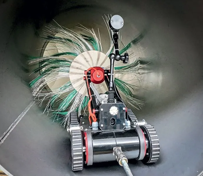 Sofern anhand der Kameraaufnahmen festgestellt wird, dass die Rohre und Kanäle verschmutzt sind, kommt der Reinigungsroboter erneut zum Einsatz. „Der Roboter ist ausge­sprochen wendig, er verfügt über einen Vor- und Rückwärtslauf, auch im 90-Grad-Winkel“, erläutert Niederlassungsleiter Matthias Kellner. Auf Wunsch hält er alles auf Video fest und kann im Bedarfsfall auch gleich die Reinigung von Rohren mit einem Durchmesser bis zu einem Meter direkt im Anschluss an die Inspektion durchführen.