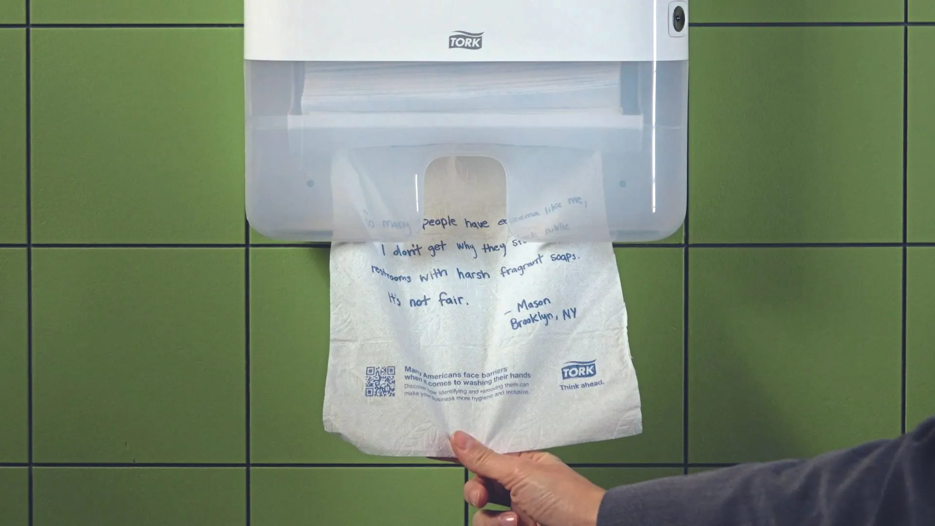 Die Mission von Tork, die Hygiene in öffentlichen Waschräumen zu verbessern und dabei insbesondere auch inklusiver zu gestalten, wurde erstmals im März dieses Jahres auf dem "Responsible Business USA 2024"-Event von Reuters in New York City vorgestellt. Hier diskutierte Amie Kromis, DEI Director bei Essity Nordamerika (DEI steht für: Diversity, Equity and Inclusion), mit Führungskräften aus der ganzen Welt darüber, wie Unternehmen die ökologische und gesellschaftliche Nachhaltigkeit ihrer Aktivitäten und Lösungen verbessern können. In den Waschräumen der Veranstaltungsstätte waren auf bedruckten Papierhandtüchern handschriftliche Notizen von Personen zu lesen, die mit Barrieren bei der Händehygiene zu kämpfen haben. Mit diesem "Appell auf dem Papierhandtuch" hatte Tork ebenfalls im März ausgehend von den USA eine weltweite Kampagne zur Förderung inklusiver Hygiene gestartet.