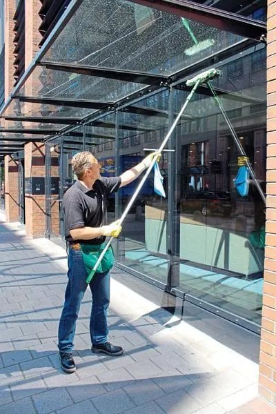 Beim Einsatz langer Stangen vom Boden aus besteht für die Glasreiniger zwar keine Absturzgefahr, doch die Arbeit ist körperlich sehr anstrengend. Die Haltearbeit erfordert einen hohen Kraftaufwand und belastet die Muskulatur im Nacken-, Schulter-, Arm- und Rückenbereich. Durch den Blickkontakt zur Reinigungsbürste wird der Kopf zusätzlich ungünstig nach hinten geneigt. Auch wenn die Beschäftigten ergonomische Arbeitsweisen anwenden (vorwärts und rückwärts gehen), sich abwechseln und genügend Erholungspausen einlegen, ist die Verwendung von Stangensystemen in Einsatzhöhen von mehr als 18 Metern keine Ideallösung. Besser ist der Einsatz – sofern es die Architektur des Objekts zulässt – von Hubarbeitsbühnen. Nicht zuletzt liegt es aber in der Verantwortung der Architekten, gute Voraussetzungen für möglichst gefahrlose und ergonomiegerechte Reinigungsarbeiten schon in die Projektierung einzubeziehen.