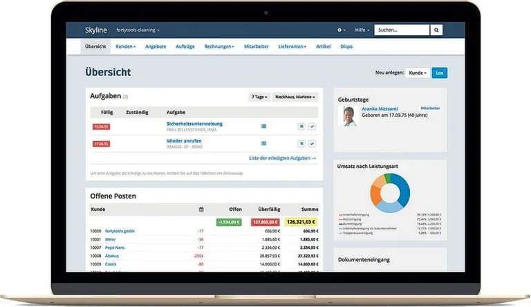 Rechnungen schreiben, Daten verwalten und Einsätze planen: Mit der Gebäudereiniger-Software Skyline können diese Aufgaben schnell und professionell erledigt werden. Als Online-Software lässt sich Skyline überall nutzen, wo man Internetzugriff hat. Das ist praktisch, um unterwegs oder bei einem Einsatz Daten einzusehen oder eine Rechnung aufzurufen.