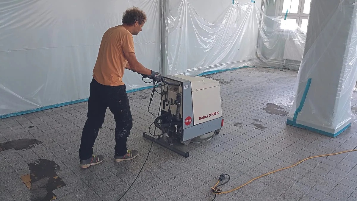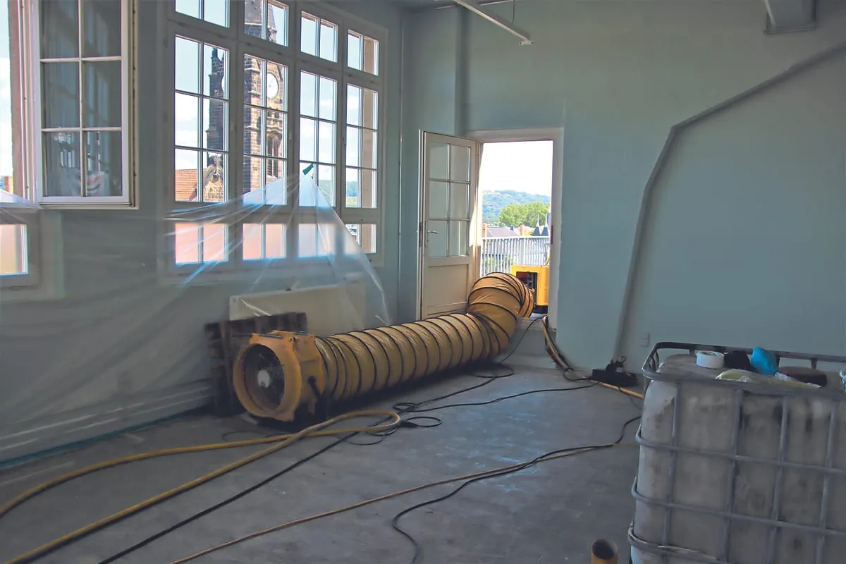 Nachdem das Verfahren klar war, wurde die Baustelle in Phase 2 für die wasser- und chemikalienbasierten Tätigkeiten vorbereitet und die Wände und Säulen mit Folie abgehängt. Aus Gründen des Arbeitsschutzes wurde zudem eine leistungsfähige Absaugvorrichtung aufgestellt, mit der die gebrauchte Luft aus dem Innenraum nach draußen abgeführt wurde.