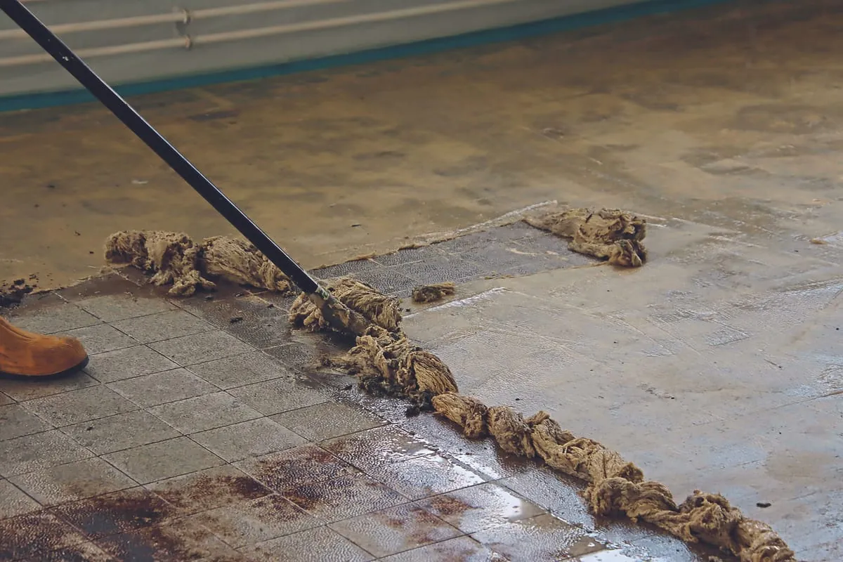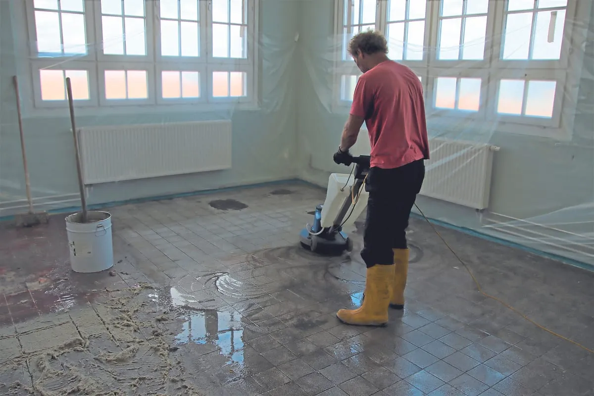 Nach der mehrstündigen Einwirkzeit wurde der bräunliche Mix aus Abbeizer und gelöstem Teppichkleber bahnenweise von den bearbeiteten Flächen abgespachtelt. Die Pampe wurde in Sammelbehälter gegeben und zur fachgerechten Entsorgung gebracht. Im nächsten Arbeitsschritt mussten die verbliebenen Reste des Abbeizers mit Wasser abgewaschen werden. Hierzu wurde eine Hochdruckreinigungskrake mit Vakuumsauger eingesetzt. "Nach der ersten Nassbehandlung war bereits der ursprüngliche Boden zu erkennen. In den rutschhemmenden, genoppten Fliesen hatte sich jedoch der Schmutz vieler Jahrzehnte festgesetzt, weshalb wir anschließend eine Grundreinigung durchgeführt haben“, erläutert Torsten Höhne. "Dazu haben wir die Fläche mehrmals mit einer Einscheibenmaschine mit Mikrofaserpads und einem leistungsfähigen Steinreinigungsmittel für Granit abgefahren und danach noch einmal mit der Hochdruckreinigungskrake gereinigt. Im letzten Arbeitsgang wurde die gesamte Fläche mit einem Wischautomaten und einem leicht alkalischen Unterhaltsreiniger neutralisiert. Schlussendlich lag uns das Original mit den unverkennbaren Spuren einer langen industriellen Nutzung zu Füßen.“