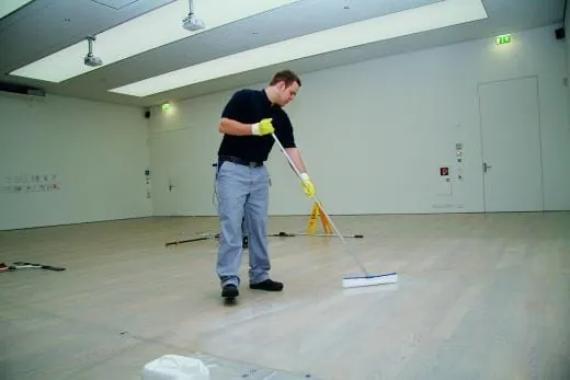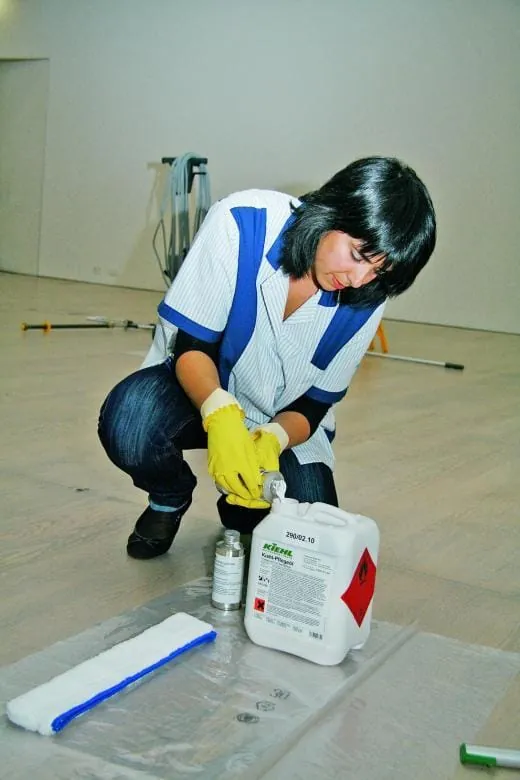 Zunächst hatten die Gegenbauer-Mitarbeiter mit dem Holz- und Parkettpflegeprogramm der Johannes Kiehl KG Testflächen auf dem Holz angelegt, um ihrem Kunden das geplante Produkt und seine Anwendung vorzuführen. Das Kunstmuseum muss hohe Anforderungen stellen, denn die Exponate sind wertvoll und brauchen ein spezielles Raumklima, um die Leinwände und Farben zu erhalten. „Überall sind Messinstrumente angebracht“, deutet Romano auf die kleinen Geräte, die die Luftfeuchtigkeit kontrollieren. „Wir müssen in diesem Objekt wie in keinem anderen darauf achten, nicht zu viel Feuchtigkeit einzubringen.“ Entsprechend durften auch das Produkt für die Unterhaltreinigung des Parketts und das Pflegemittel nur geringe Anteile an Lösungsmittel enthalten. Sämtliche Stoffe, die in die Raumluft geraten, könnten den Gemälden schaden – Leinwände und Farben atmen –, daher musste der Dienstleister bei der Auswahl der Produkte besonders sorgfältig vorgehen. Die Ausstellungsflächen – davon 3.500 m2 Holzboden – werden je nach Frequentierung der Räume alle drei Monate bis einmal im Jahr geölt. Kommt eine der Wechselausstellungen besonders gut beim Publikum an und strömen die Menschenmassen nur so übers Parkett, kann es auch vorkommen, dass der Dienstleister die Flächen früher als geplant ölen muss. Andere Flächen werden – je nach Platzbedarf – zeitweise stillgelegt. „Der Turnus verschiebt sich also immer wieder. Darauf müssen wir flexibel reagieren – trotz des engen Zeitfensters für die Arbeiten“, erklärt Romano. Mit dem engen Zeitfenster ist der Montag gemeint. An allen anderen Tagen hat das Museum geöffnet. Bar und Restaurant sind sogar sieben Tage die Woche geöffnet. Zwischen 7 und 10 Uhr am Vormittag bleibt Zeit für die tägliche Unterhaltsreinigung, die sechs bis zehn Mitarbeitet der GGS erledigen. Die Parkettflächen werden einmal die Woche feucht mit einem seifen- und wachsfreien Parkett- und Laminatreiniger (Parketto-clean-Konzentrat) gereinigt, ansonsten verwenden die Mitarbeiter Gazetücher. Seit Oktober wird außerdem einmal die Woche eine neue Wischpflege für geölte Holzflächen benutzt (Parkettin-Konzentrat). „Dieses Produkt ist erst seit wenigen Wochen erhältlich und wird auf der kommenden Interclean in Amsterdam vorgestellt“, berichtet Thomas Vetter, Produktmanager für Holzpflegeprodukte bei der Johannes Kiehl KG.