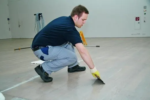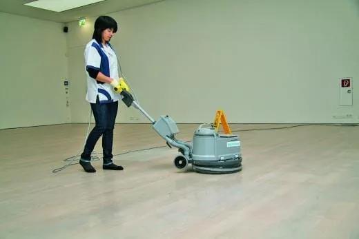 Montags, am Ruhetag des Museums, müssen die turnusgemäßen Pflegemaßnahmen wie das Ölen des Parketts oder die Fassadenreinigungsarbeiten ausgeführt werden. Bevor der Boden geölt werden kann, fährt Vorarbeiterin Sandra Ramos die Fläche mit dem Trockenmopp ab und nimmt dabei Grobschmutz auf. Im zweiten Schritt, der Trockenreinigung, bereitet Edvin Kosaric, Auszubildender im 2. Lehrjahr, den Boden mit der Einscheibenmaschine mit absoluter Absaugung auf die Pflege vor. Das blaue Pad ist besonders feinkörnig und nimmt nur feinste Partikel von der Holzoberfläche auf. Der helle Staub- und Schmutzpuder ist gut auf dem blauen Pad zu erkennen. Sandra Ramos mischt die Pflegeprodukte an. Sie bestehen aus zwei Komponenten, der Abtönfarbe (Colorfix weiß) und dem Imprägnieröl (Pflegeöl). Nachdem sie die benötige Menge abgemessen hat, schüttelt sie die Produkte gut durch. Wenn die Mischung gleichmäßig weiß ist, kann das Ölen beginnen. Edvin Kosaric hat die Fläche in der Zwischenzeit noch mal mit einem leicht feuchten Mopp von letzten Staubresten befreit. Dann gießt er die Emulsion portionsweise – etwa 250 ml pro 10 m2 – auf das Parkett. In Schleifen verteilt er die weiße Flüssigkeit mit dem Wischwiesel zu einem dünnen gleichmäßigen Auftrag. Jetzt kann das Öl 30 Minuten einziehen. Nach dieser halben Stunde nimmt er mit einem Moosgummi (Neoprengummi) das überschüssige Öl ab und arbeitet mit dem Spachtel nach. In einem letzten Arbeitsschritt poliert Kollegin Ramos mit der Einscheibenmaschine und weißem Pad die Fläche ab. Nach einer Aushärtungszeit von 24 Stunden ist der Boden wieder frisch und vor den Tritten der Museumsgäste geschützt. Schade nur, dass die wenigsten Besucher einen Blick auf das Kunstwerk zu ihren Füßen werfen, aber Otto Dix, Adolf Hölzel und Willi Baumeister sind eben eine äußerst harte Konkurrenz – sogar für ein Parkett aus Eiche.