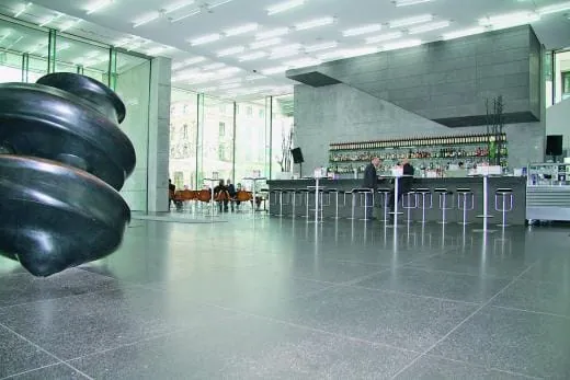 So sind im Foyer und Barbereich Bodenplatten aus schwarzem Lavastein verlegt. Über der Bar ist das Material in die Wand eingearbeitet. Hier kann man gut erkennen, wie offenporig der Stein im Originalzustand ist. „Deshalb haben wir uns entschlossen, die Bodenflächen im Eingangsbereich zu imprägnieren. An der Bar wird schließlich auch mal Kaffee, Cola oder ein Glas Sekt verschüttet und würde den Boden angreifen“, erklärt Osvaldo Romano. Er ist technischer Leiter bei der Gegenbauer Gebäudeservice GmbH. Er erinnert sich, wie seine Kollegen die komplette Foyerfläche (500 m2) an nur einem Tag imprägnierten. „Auf Wunsch des Museums haben wir ein lösungsmittelfreies Produkt (Kiehl Impranet) verwendet, das auch auf feuchte Flächen aufgetragen werden kann. So war es möglich, die Arbeiten schnell und ohne große Umstände für den Kunden auszuführen.“ Der Lavastein hat dabei sein natürliches Aussehen behalten und die Imprägnierung machte sich schon kurz nach der Eröffnung bezahlt. Bei einer Protestaktion wurde gelbe Farben auf den Lavasteinboden gesprüht. „Das wäre ohne Imprägnierung ein Katastrophe geworden“, sagt Romano.