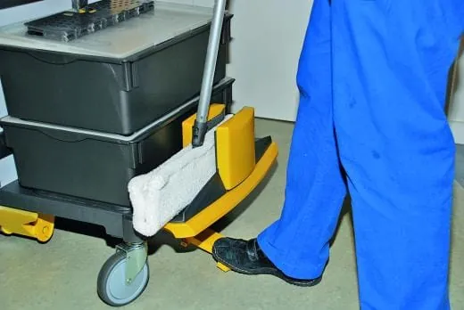 Die Reinigungsdüse Cleenjet dagegen ist eine Vorrichtung zum Absaugen von Trockenwischbezügen. Die Düse saugt alle bei der Trockenreinigung anfallenden losen Staub- und Schmutzpartikel vom Moppbezug ab. Durch das Gedrückthalten der Tritttaste wird der Reinigungswagen fixiert und der Staubsauger aktiviert. Der Mopphalter mit dem verschmutzten Moppbezug muss mehrmals zwischen den Reinigungsdüsen hin und her gezogen werden, wodurch der Schmutz abgestreift und eingesaugt wird. Der Staubsauger schaltet automatisch ab, sobald die Tritttaste gelöst wird. Hauptvorteil: Die Verwendungsdauer des Trockenmopps wird um ein Vielfaches verlängert.