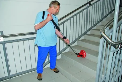 Bei der Reinigung von Treppen kommt der akkubetriebene MotoScrubber zum Einsatz. Weil das Gerät wasserdicht gekapselt ist, wird es auch für Arbeiten in Schwimmbecken unter Wasser eingesetzt.