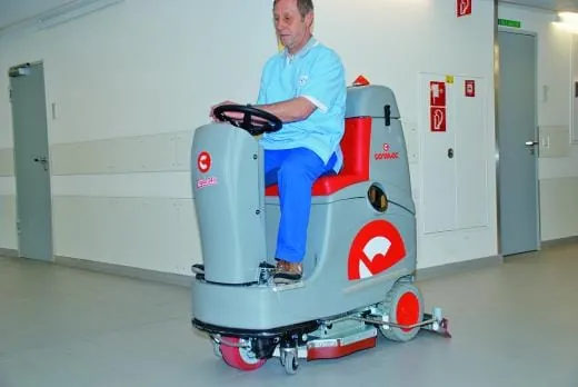 Auf verstellten Flächen mittlerer Größe wechseln die Mitarbeiter auf den leisen und kompakten Aufsitz-Nassschrubbautomaten 24 B. Er verfügt über einen patentierten Saugfuß, der den Bewegungen der Maschine auch in Kurven folgt, um Wasser auch an schwer erreichbaren Stellen aufzunehmen; die Saugfußbreite beträgt 79 cm und der Wendekreis liegt bei 160 cm. Dank der geringen Größe kann die Maschine handgeführte Automaten ersetzen, ist damit produktiver und erleichtert die Arbeit des Bedieners.