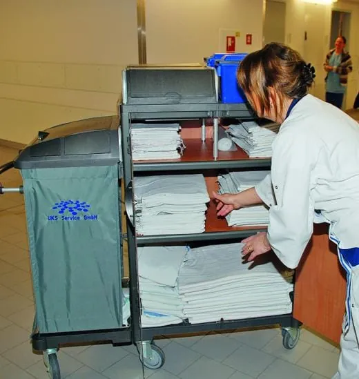 Bei der Neukonzeption der Reinigung entschied man sich hausintern beispielsweise für ein zweistufiges Nasswischsystem im Bereich der Patientenzimmer. Die Wahl fiel dabei auf das Bodenwischsystem Twixter von Vermop, das einen entscheidenden Vorteil bietet: Sowohl für die erste Stufe (Nasswischen) als auch für die zweite Stufe (Trocknen) wird ein und derselbe Mopp verwendet. Zunächst wird die eine Seite des Bezugs dosiert befeuchtet und der Boden nass gewischt, um dann mit Hilfe des speziellen Halters den Mopp zu wenden und mit der anderen Seite den Boden zu trocknen. Zum System gehören entsprechende mit zwei unterschiedlichen Seiten (Wischen/Trocknen) ausgestattete Wischbezüge, ein über ein Gelenk wendbarer Halter und eine Wanne mit Dosiereinsatz. Trotz der Verwendung dieses speziellen Mopps für beide Arbeitsschritte sind immer noch rund 13.000 Mopps täglich im Einsatz. Ein interessantes Detail am Rande: Eingesetzt werden größere Wischbezüge, die im häuslichen Bereich nicht verwendet werden können; dadurch konnte der Schwund an Mopps drastisch gesenkt werden.