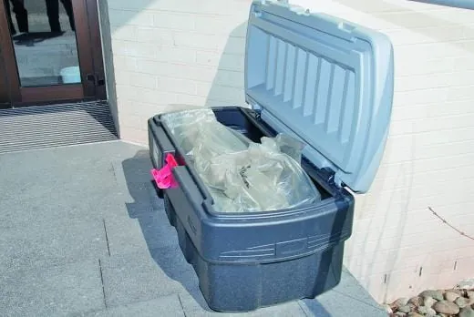 Links Täglich sind rund 13.000 Wischbezüge im Einsatz. Um das Handling zu erleichtern, werden die verschmutzten Mopps in Boxen geworfen, die vor jedem Gebäude bereitstehen.