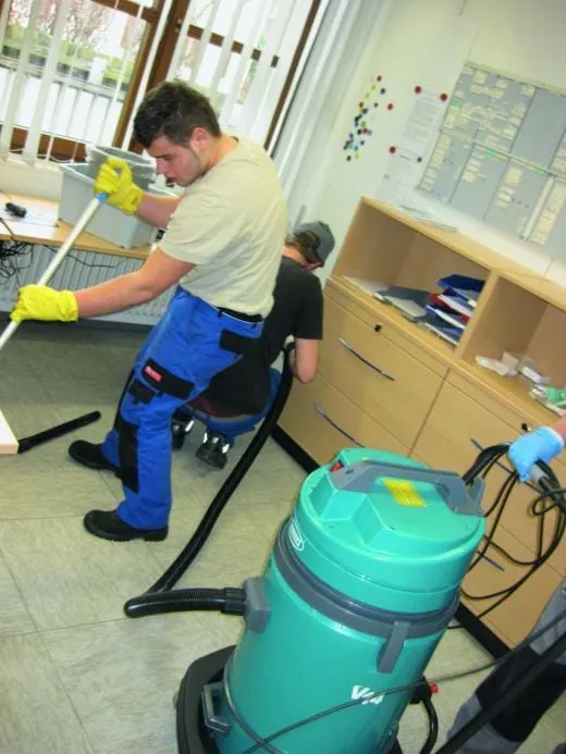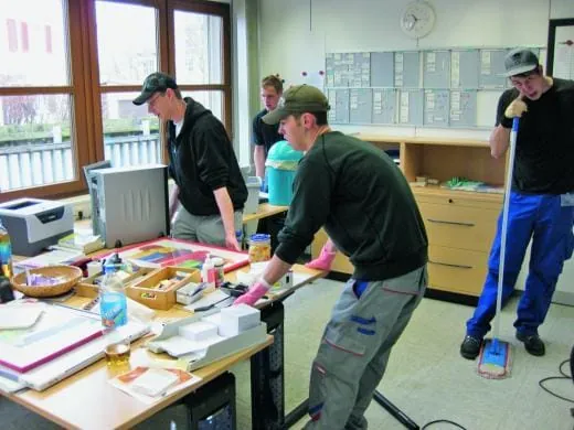 Aufgabe der Azubis bei der Besprechung des Projekts im Theorieunterricht ist es, Chef zu spielen und sich um die Organisation zu kümmern. Jeweils drei Schüler werden in einem Büroraum die Glasreinigung und die Grundreinigung des elastischen PVC-Belags mit anschließender Einpflege durchführen. Einer trägt als Vorarbeiter die Verantwortung. Bei einer so großen Fläche kann jeder Schüler üben und dem Praxislehrer sein Können beweisen.