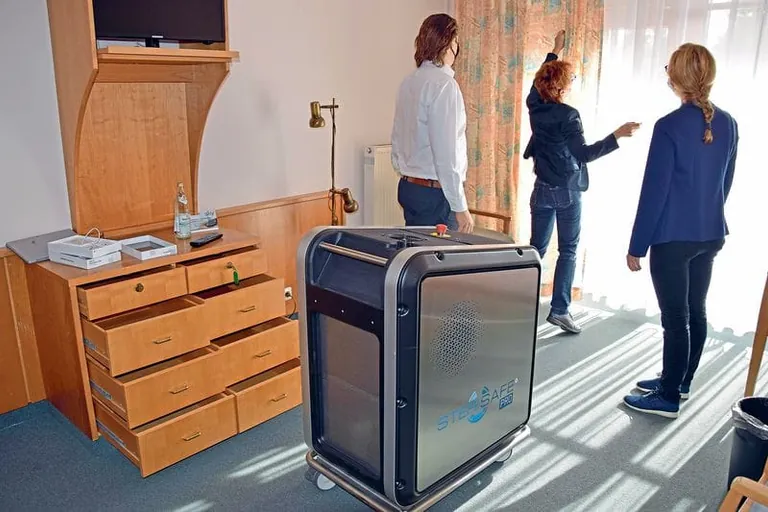Das mobile Gerät ist im Objekt flexibel einsetzbar und kann via Tablet bedient werden. Während der Prozedur ist es wichtig, dass der Raum nicht betreten wird und Rauchmelder, Lüftungen oder andere Öffnungen zuvor abgedichtet werden. Zur Sicherheit wird auch die Tür von außen mit Isolierband abgeklebt. Da die Steuerung von außerhalb des zu desinfizierenden Raumes erfolgt, ist die Sicherheit für Bediener, Patienten und Mitarbeiter stets gegeben.