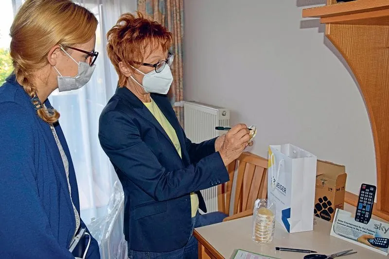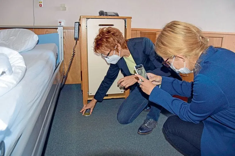 Um die Wirksamkeit des Sterisafe Pro zu kontrollieren, wurden jeweils vor und nach dem Desinfektionszyklus mit Rodac-Platten Abklatschproben von diversen Flächen genommen. Zu den Probeentnahmeflächen zählten beispielsweise die Matratze, der Teppichboden, der Holzgriff am Stuhl, die Waschbeckenarmatur, das Schubladeninnere, die Tischoberfläche, die Vorhänge und die Lichtschalter. Die Proben nahmen Anna Hils, Geschäftsführerin des Parat Institut für Hygiene, und Mariell Weber von der KDS vor.