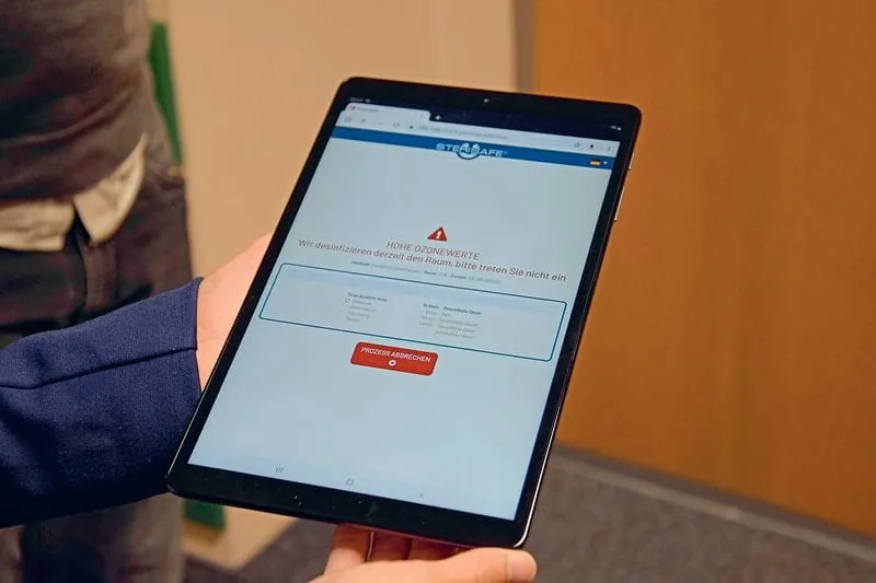 Der Desinfektionsprozess kann i n Echtzeit verfolgt und überwacht werden. Erst nach der vollständigen Entfernung des Ozons kann der desinfizierte Raum wieder betreten werden. Wann es soweit ist, überwacht ein im Sterisafe Pro eingebautes Messgerät, dies wird dem Bediener außerhalb des Raumes auf seinem Tablet angezeigt. Ozon hat den Vorteil, dass es auch bei relativ hohen Konzentrationen, anders als zum Beispiel Wasserstoffperoxyd, genau gemessen werden kann. Dadurch kann der vollständige Vorgang zudem automatisch vom Gerät dokumentiert werden und garantiert so die Prozesssicherheit und Validierung der Desinfektion. Der Hersteller stellt die automatisch generierten Berichte online zur Verfügung und unterstützt somit die Gebäudereiniger in ihrem Bestreben nach voller Transparenz und Compliance gegenüber ihren Kunden.