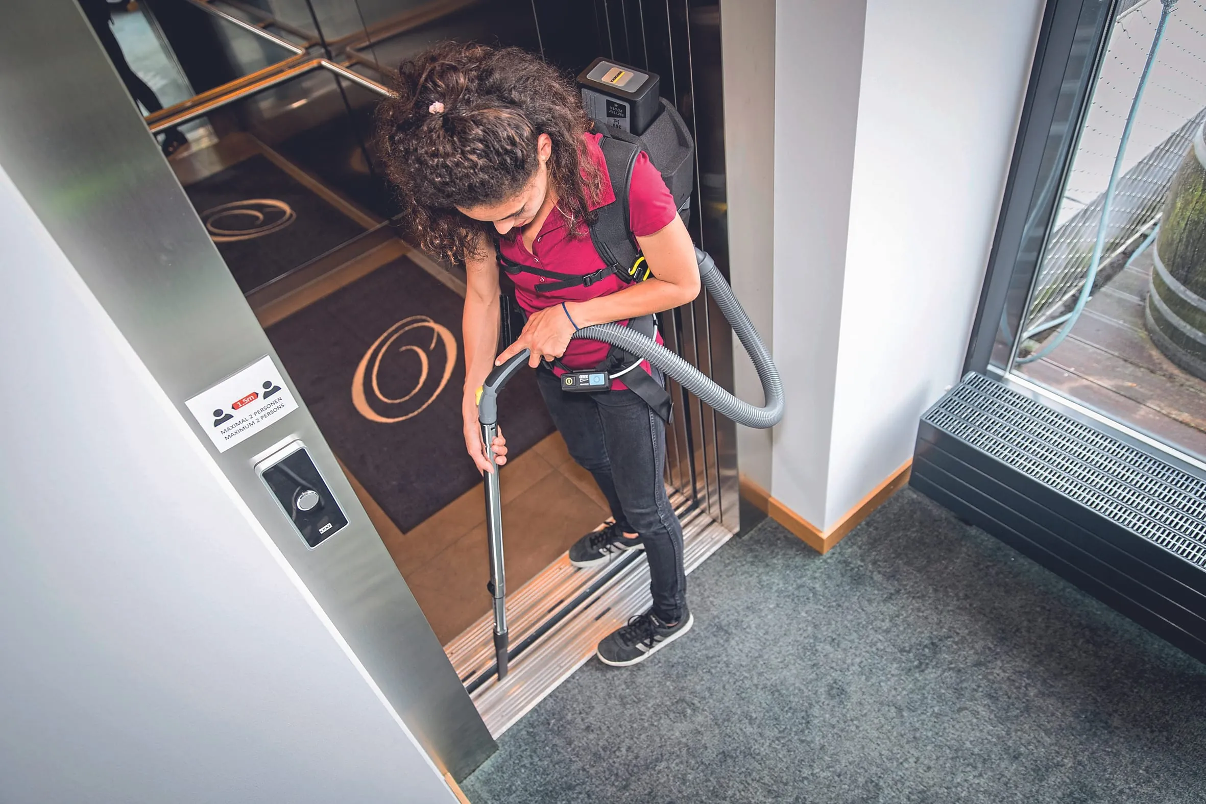 Analog zu Treppen und Rolltreppen sind auch Fahrstühle stark frequentiert und die Platzverhältnisse begrenzt. Daher sollten sie mehrmals täglich inspiziert werden. Lose Verschmutzungen lassen sich mit einem Rucksacksauger oder einem Elektrobesen von der Bodenfläche entfernen. Ein Mopp ist für haftende Verunreinigungen geeignet. Eine praktische Lösung für verglaste oder verspiegelte Aufzüge ist ein handgehaltener Oberflächensauger. Rutschgefahr und Verunreinigungen durch Spritzwasser lassen sich damit vermeiden, da das Gerät das Wasser direkt wieder aufnimmt.