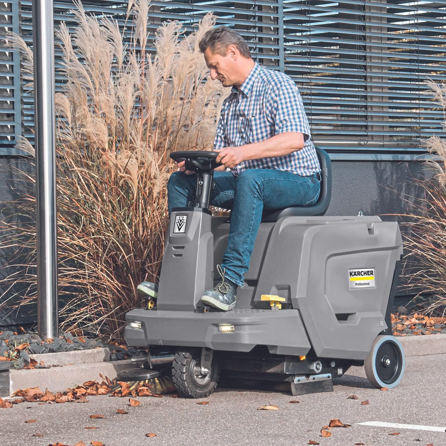 Bei warmer, trockener Witterung können Parkflächen, Zufahrtswege und -rampen sowie Gehwege mit Kehrsaugmaschinen gereinigt werden. Sie haben dabei den entscheidenden Vorteil, dass sie aufgewirbelte Partikel direkt mit einsaugen und die Autos auf Parkplätzen nicht eingestaubt werden. Kehrmaschinen mit einer leicht zu öffnenden Grobschmutzklappe sind hilfreich, um den Müll rund um Einkaufswagenstationen zu beseitigen. Handgeführte Kehrmaschinen oder Aufsitzmodelle sind gut geeignet, um lose Verschmutzungen von Wegen, aus Parkhäusern, von Parkplätzen oder Eingängen zu entfernen.
