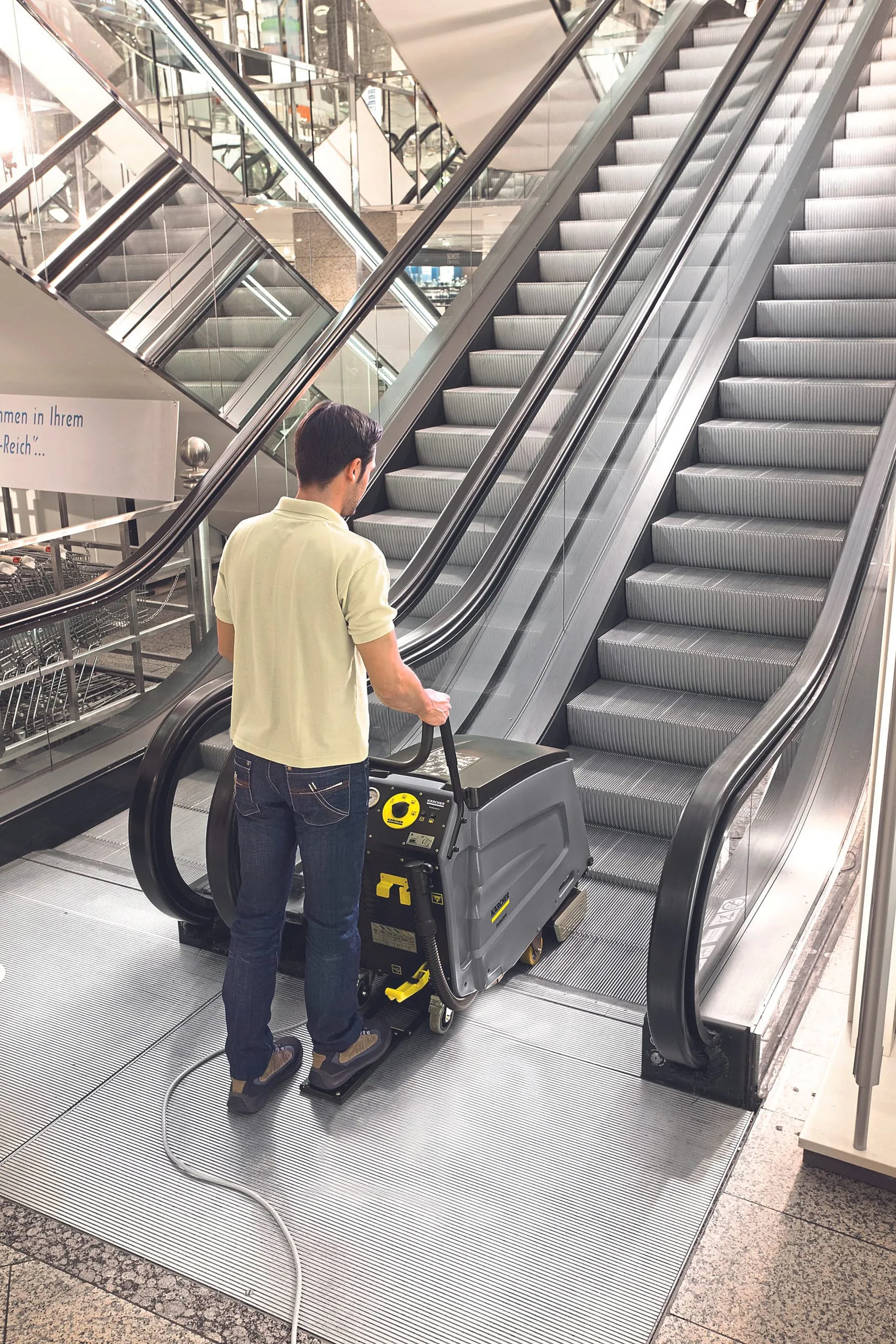 Innerhalb des Einkaufszentrums sorgen Rolltreppen und Laufbänder für ein entspanntes Einkaufserlebnis. Sie befördern täglich eine Vielzahl an Kunden und hartnäckige Verschmutzungen wie verschüttete Getränke oder Speisereste sind keine Seltenheit. Eine Nassreinigung lässt sich hier deshalb meist nicht vermeiden. Kaugummi, festhängende Steinchen und andere grobe Verunreinigungen sind vorab manuell mit einem Kratzer zu entfernen und aufzukehren. Um die Rolltreppe anschließend wieder zum Glänzen zu bringen, ist ein Rolltreppenreinigungsgerät eine effiziente Lösung. Dabei greifen Führungskämme in die Rolltreppe ein, dichten die Oberfläche zum Saugkanal hin ab und erzeugen so den erforderlichen Unterdruck zur Absaugung. Je nach Rolltreppenfabrikat sind die Kämme in verschiedenen Ausführungen erhältlich. Zudem sollten Seitenwände und Handläufe regelmäßig saubergemacht werden. Um die Handläufe zu reinigen, werden vorkonditionierte, mit Desinfektionsmittel getränkte Mikrofasertücher einfach auf das fahrende Handlauf-Band gehalten.