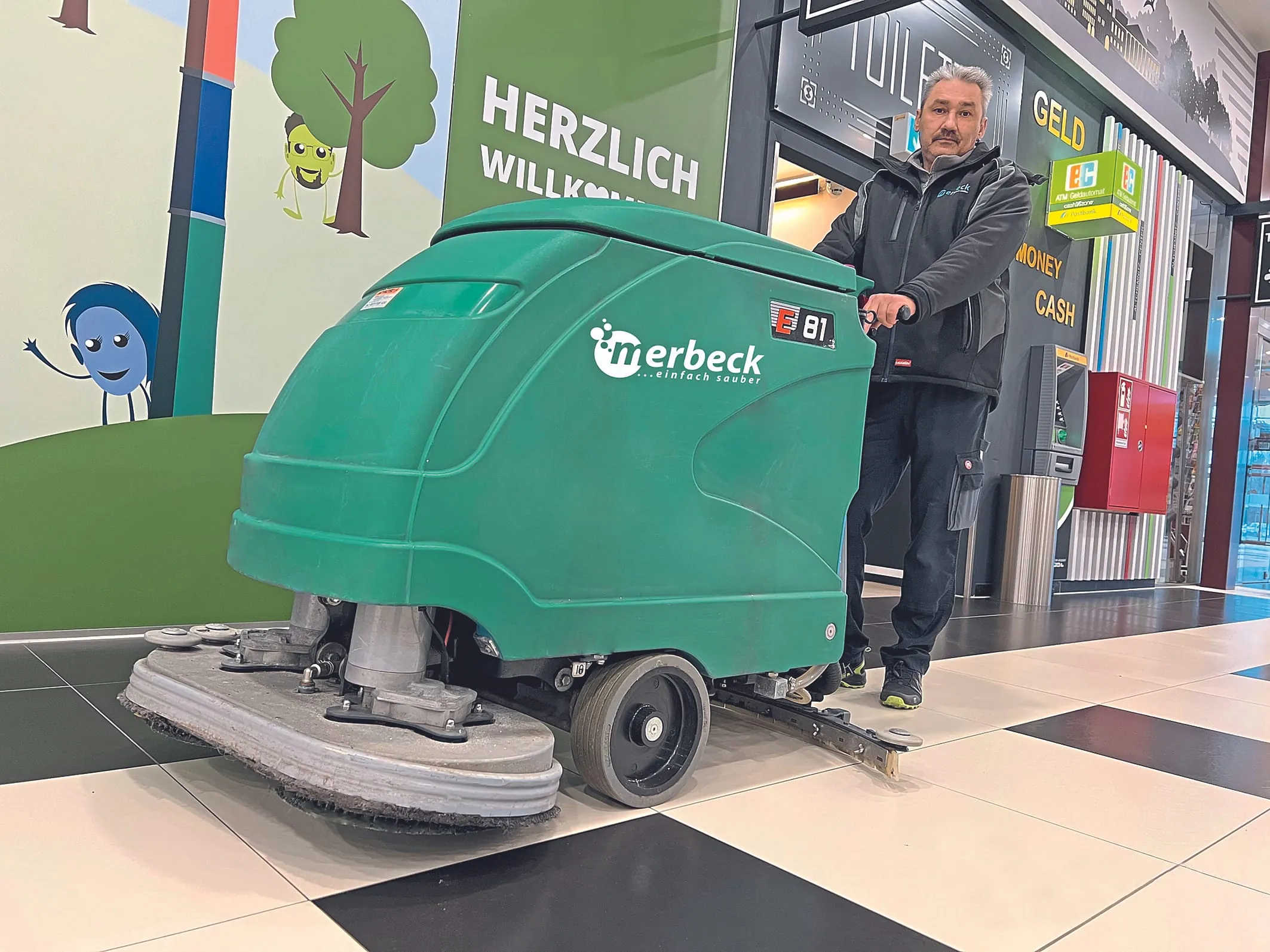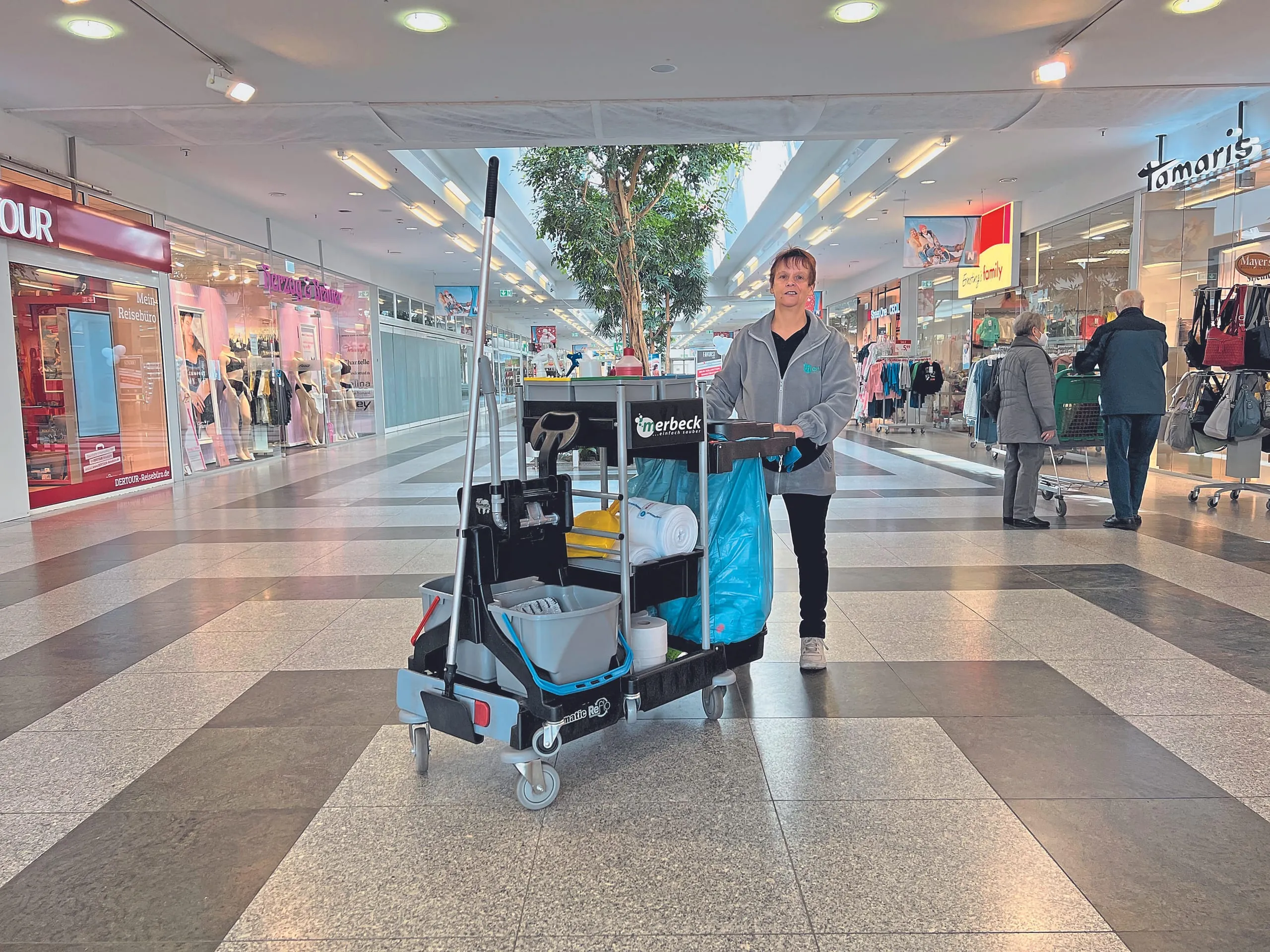 Was die Reinigung eines Einkaufszentrums betrifft, stehen nicht nur die Ladenlokale im Fokus. Parkhäuser, Parkplätze und Außenanlagen – hier wird auch der Winterdienst von den Merbeck-Mitarbeitern übernommen – müssen ebenso in Ordnung gehalten werden wie die Verkaufsflächen. Und nicht zu vergessen Büros, Sanitärbereiche, Lagerräume, Vitrinen, Keller sowie Aufzüge, Rolltreppen und Gänge.