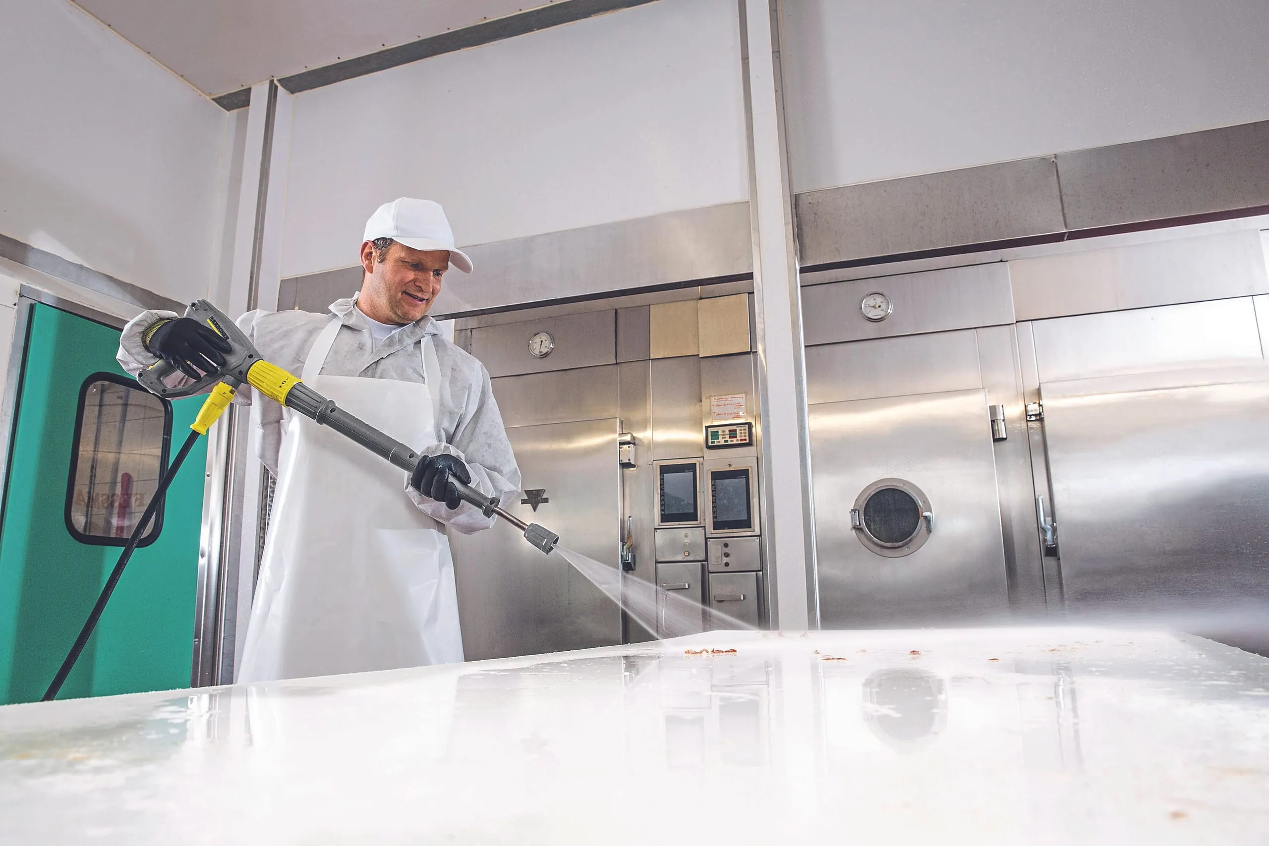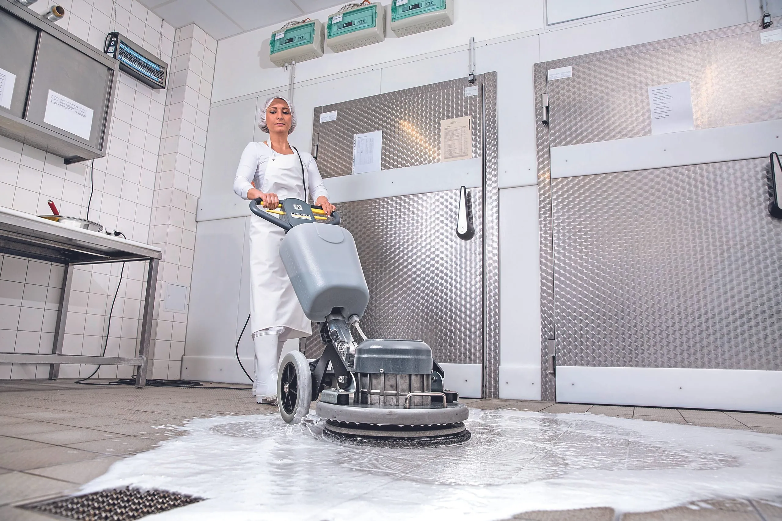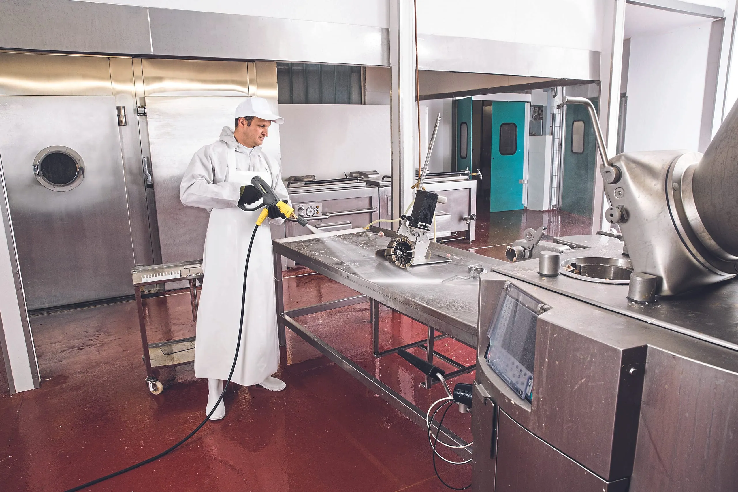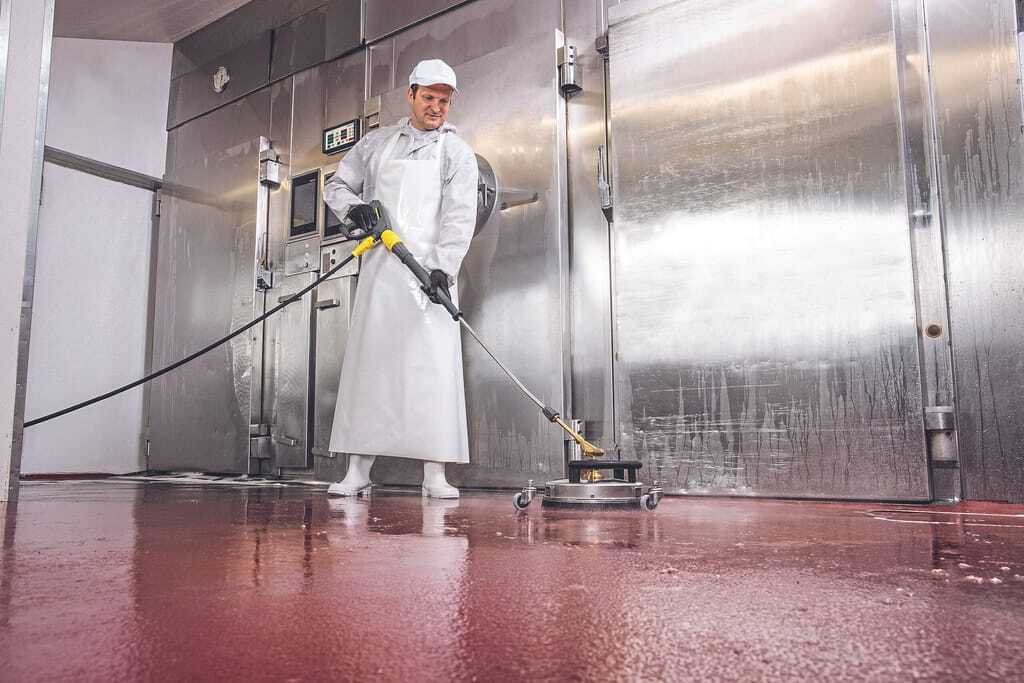 In Schlachtbereichen auftretende Verschmutzungen wie Fette, Eiweiße und Blut tragen zu einer erhöhten Rutsch- und damit Unfallgefahr bei. Für die Böden in Metzgereien ist der Einsatz eines Hochdruckreinigers zu empfehlen – in Kombination mit einem Flächenreiniger, einem Aufsatz mit rotierenden Düsen. Der Vorteil dabei: Durch den Flächenreiniger verteilt sich die Reinigungsflotte und Gischt des Spülwassers nicht großflächig um den Arbeitsbereich herum, sondern bleibt konzentriert. Die Reinigung mit Hochdruck ist schnell, effizient und durch die Bodenabläufe, die in den Produktionsräumen vorhanden sind, komfortabel möglich – höchstens muss ab und zu mit einem Wasserschieber nachgearbeitet werden. Eher selten, aber je nach Arbeitsumgebung ebenfalls möglich, ist der Einsatz einer kleinen Scheuersaugmaschine oder einer oszillierenden Einscheibenmaschine, um die Böden sauber und trittsicher zu bekommen.