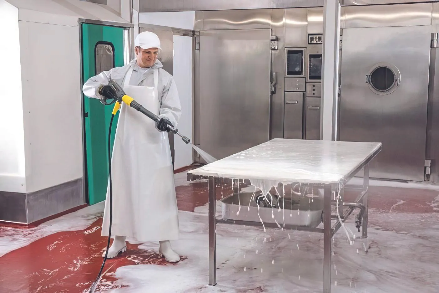 In lebensmittelverarbeitenden Betrieben haben effiziente Reinigung und Desinfektion Priorität. In Metzgereien und kleinen Schlachtbetrieben fallen vor allem Verunreinigungen wie Blut, Proteine und Fette, grobe Fleischabfälle und Knochenreste an. Sie müssen beseitigt werden, damit Keime keine Chance auf Ausbreitung haben.