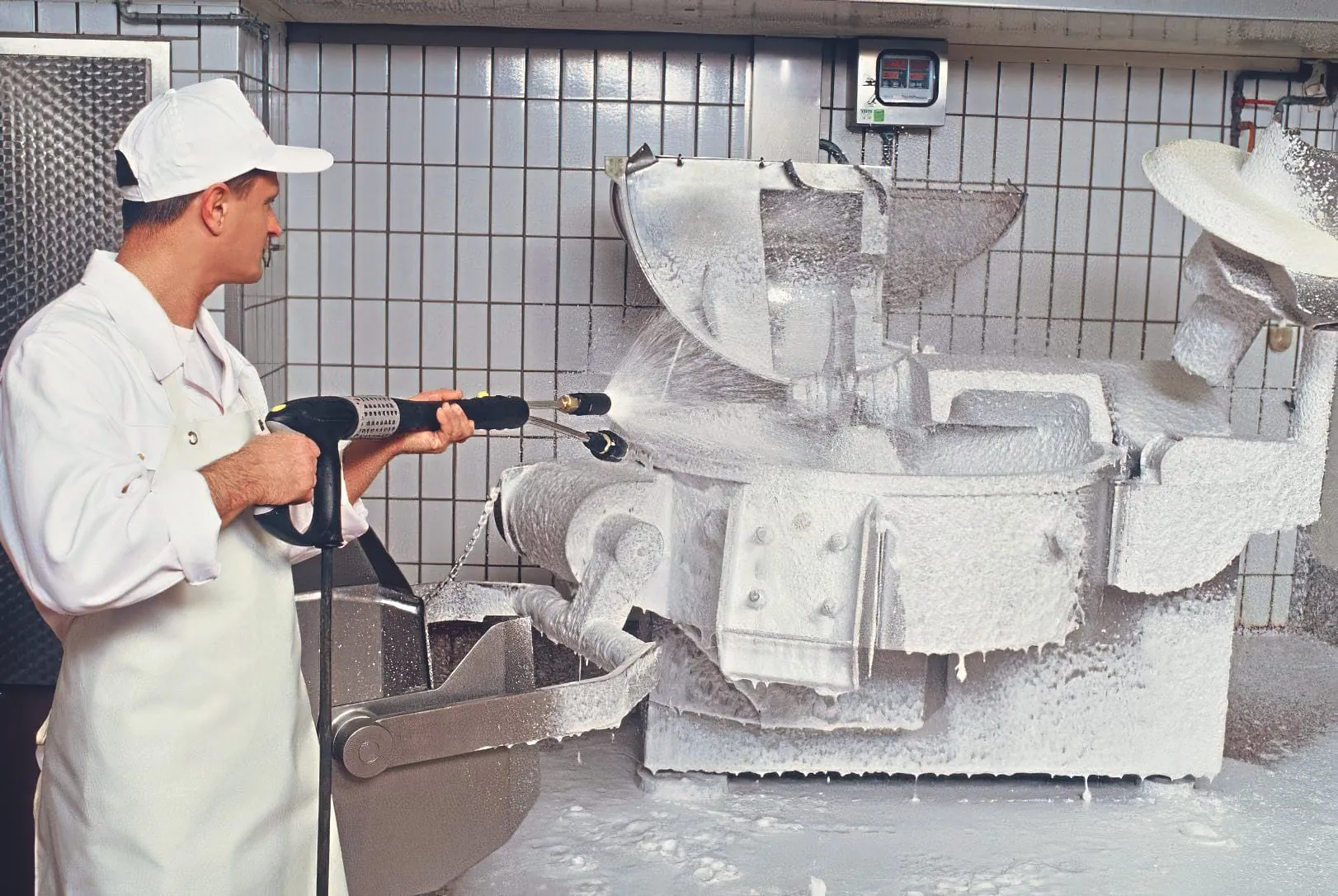 Messer, Zangen und Knochensägen gehören ebenso zur Standardausstattung in einem Metzgereibetrieb wie ein Cutter und/oder ein Fleischwolf. Diese Maschinen sind mit vielerlei Elektronik ausgestattet und entsprechend sensibel. Deshalb ist beim Reinigungsvorgang darauf zu achten, schonend zu arbeiten und den Hochdruckreiniger auf maximal 30 bis 100 bar zu regulieren. Mit einem Druckregler an der Sprühlanze lässt sich das komfortabel einstellen. So können etwa auch Messer, Sägen und Zangen mit vermindertem Druck gereinigt werden – alternativ können sie in die Spülmaschine. Auch für dieses Equipment ist bevorzugt eine Schaumreinigung anzuwenden. Für den Cutter eignet sich dafür eine sehr kurze Sprühlanze (maximal 10 cm), um schwer erreichbare Stellen komfortabel zu reinigen. Das Reinigungsintervall sollte auch hier mehrmals täglich sein. Anschließend nachspülen, abtrocknen, desinfizieren.