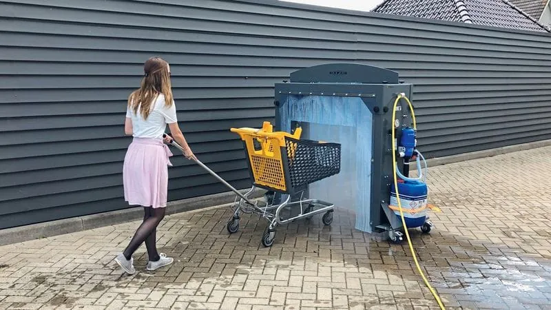 "Es ist einfach in der Bedienung, kann von einer einzelnen Person betrieben werden und man hat eine hohe Stückzahl an Einkaufswagen, die man bearbeiten kann“, betont Theo Hoefgen. Man brauche nur eine Steckdose, einen Wasseranschluss, den mobilen Rahmen und dann ein Gerät nach Wahl: entweder ein Empas-Basisgerät zur Heißwasserreinigung oder ein Injektionsgerät zum Besprühen der Wagen und Objekte mit einem Desinfektionsmittel. Auch eine Kombination aus beiden Geräten sei möglich.