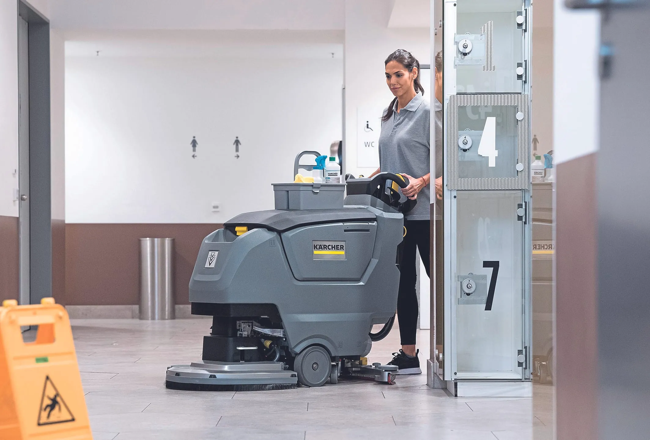Für große Flächen ist eine Scheuersaugmaschine die richtige Wahl. Je nach Größe der Fläche und verfügbarem Zeitfenster stehen Nachläufer- oder Aufsitzmodelle zur Verfügung. Abhängig vom Schmutzaufkommen kann die Fläche in der Zwei-Schritt- (erst schrubben, dann absaugen) oder in der Ein-Schritt-­Methode (schrubben und absaugen in einem Schritt) bearbeitet werden.