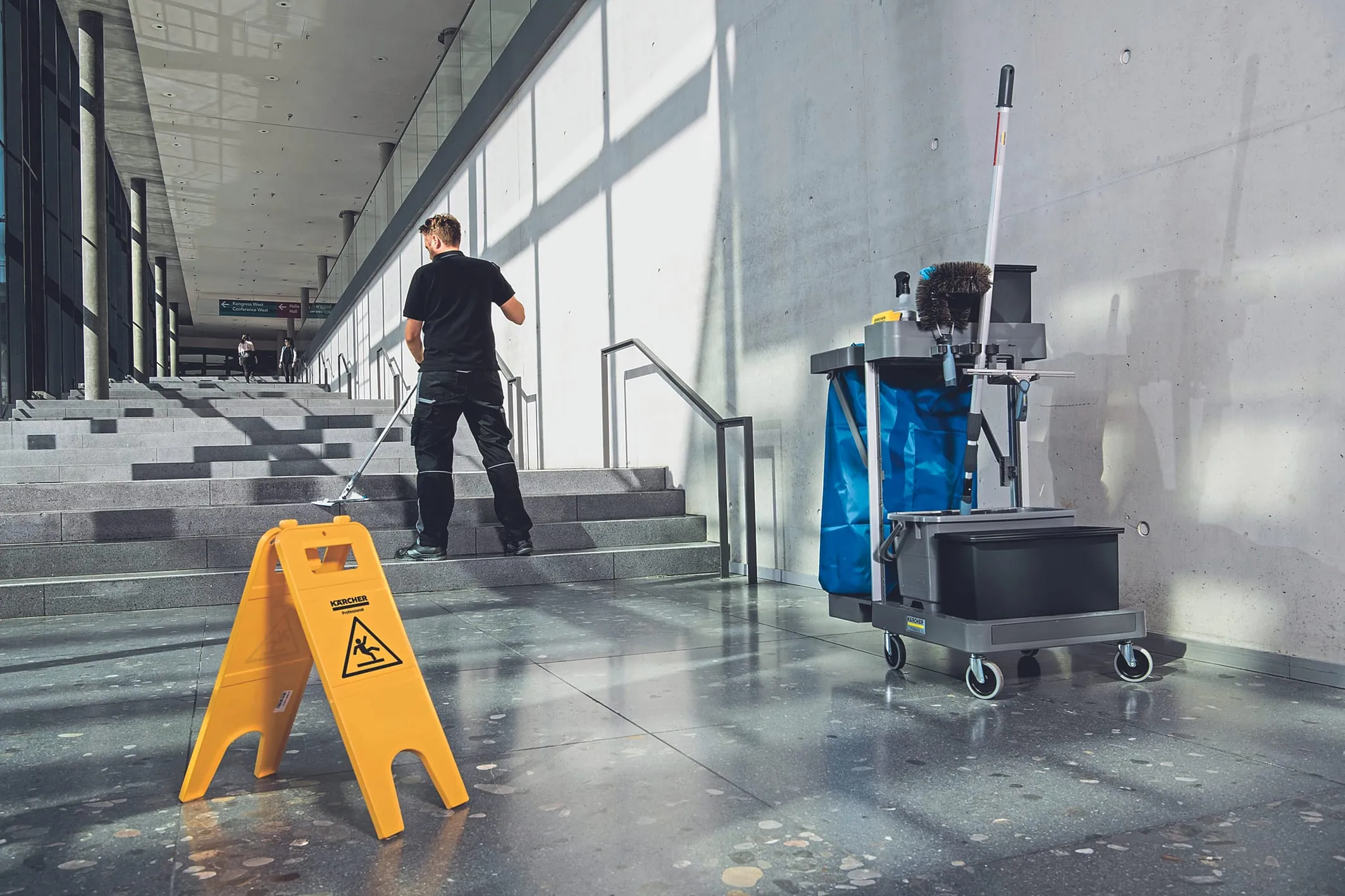 Nicht nur für ein gepflegtes Aussehen, sondern auch, um den Wert von Kunststeinböden zu erhalten, ist eine regelmäßige Unterhaltsreinigung essenziell. Je nach Verschmutzungsart und -grad kann sie entweder trocken und/oder nass durchgeführt werden. Lose Verschmutzungen in kleinen Räumlichkeiten, wie in Aufzügen oder Treppenhäusern, lassen sich mit einem Akku-Rucksacksauger, einem Elektrobesen oder durch staubbindendes Wischen mit einem Mikrofasertextil entfernen. Für größere Flächen lohnt meist die Investition in eine Kehrmaschine, um Reinigungsarbeiten zeitsparend durchführen zu können.