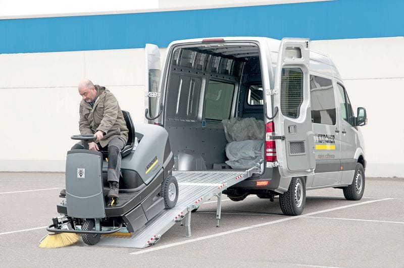 Täglich müssem in Reinigungsfirmen schwere Geräte schnell und sicher bewegt werden. Altec bietet für solche Fälle eine klappbare Aluminium-Verladeschiene. Die fest im Fahrzeug montierte RRK-Z-Rampe bietet eine komfortable Lösung beim häufigen Be- und Entladen durch leichtes Ausklappen mittels Gasdruckfeder. Durch drei Rampenteile kann eine hohe Gesamtlänge der Verladeschiene erzielt werden. Dies ergibt eine sanftere Steigung, die es ermöglicht, auch Reinigungsgeräte mit niedriger Bodenfreiheit zu verladen. Während der Fahrt steht die Rampe in senkrechter Position und wird durch Sicherungen gehalten. Dank integrierter Gummipuffer entstehen keine Klappergeräusche. Die Verladeschiene wird in unterschiedlichen Längen und Breiten sowie mit verschiedener Tragkraft hergestellt. Auch Sonderanfertigungen sind möglich.