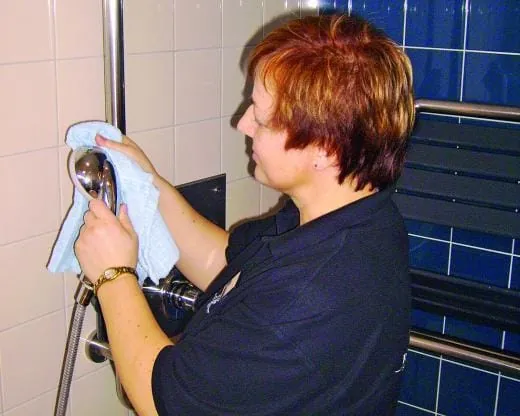Auch alle Edelstahlteile wie die Armaturen in Sanitärräumen, dem Umkleidebereich und in den Saunen, die Manschetten an den Säulen und andere Metallflächen bedürfen unter den spezifischen Bedingungen besonderer Aufmerksamkeit. „Es ist ratsam, eine zweite Garnitur Armaturen vorzuhalten, um beizeiten Ablagerungen zu entfernen“, empfiehlt Heinz Ritter. Hilfreich ist aber insbesondere die vorbeugende Behandlung sämtlicher Oberflächen mit Frowi von Fala, das den Glanz erhält sowie die Annahme von Fingerabdrücken und Korrosion verhindert.