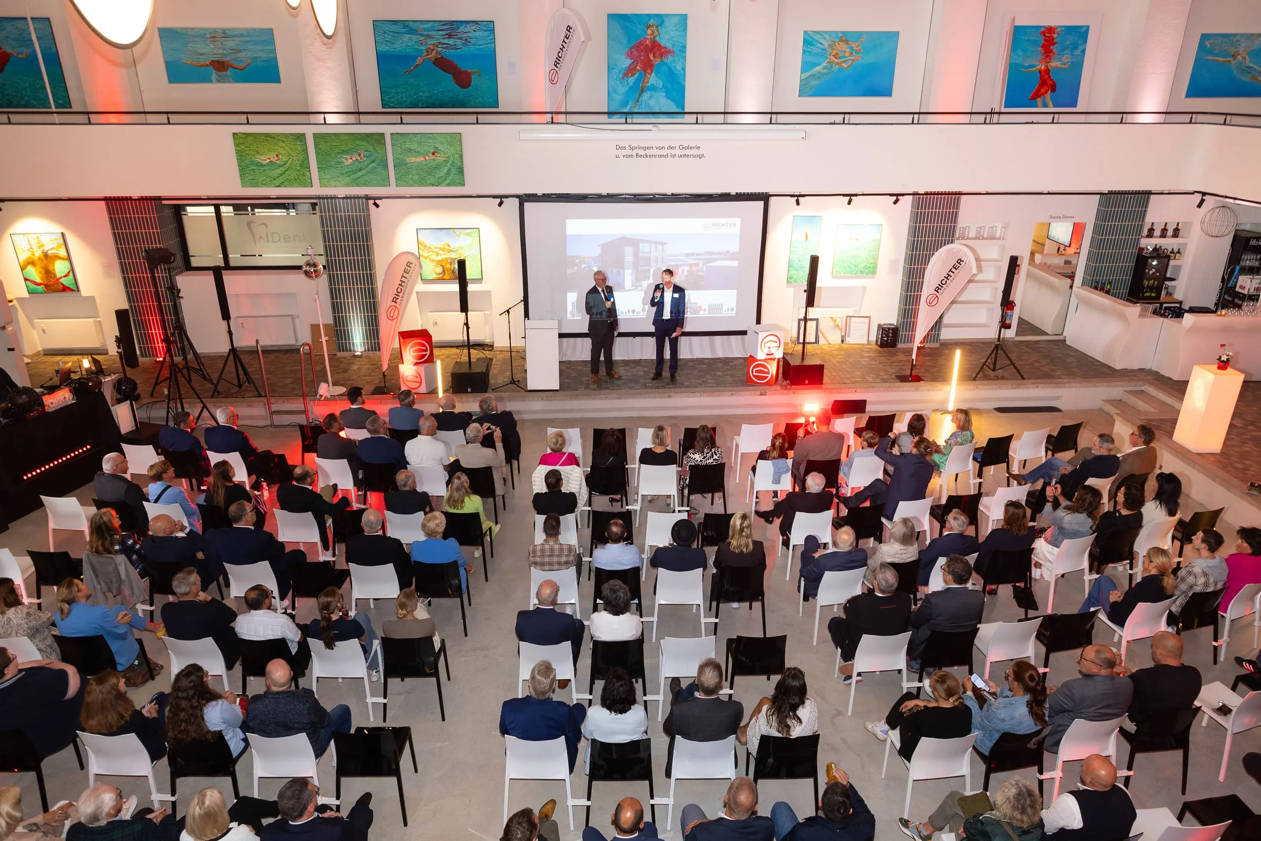 Am Abend gehörte die Bühne der Belegschaft. Nach weiteren Ansprachen und Ehrungen langjähriger Mitarbeiter verwandelte sich das Hallenbad Ost in eine große Feierlocation: DJ Marco Leistner sorgte für ausgelassene Stimmung und eine volle Tanzfläche.