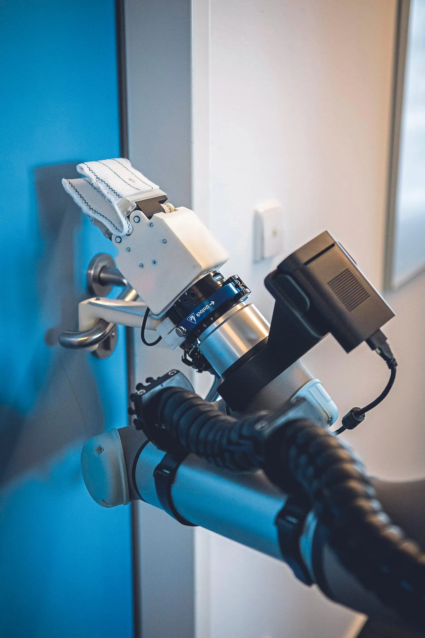 Unterhalb des Reinigungstools ist noch ein stabiler Kunststoffhaken angebracht. Mit diesem kann der Roboter Türklinken herunterdrücken, um die Tür dann aufzudrücken und durch eine Vorwärtsbewegung der mobilen Basis die Tür vollständig zu öffnen. Da die Bewegungen relativ zur Klinken-Pose, also der genauen Position und Ausrichtung, erfolgen, sind sie auf andere Türen übertragbar. Diese Funktion ist entscheidend, um Reinigungsroboter für alle relevanten Flächen wie in Patientenzimmern einsetzbar zu machen. Denn aktuell kann kein auf dem Markt ­erhältlicher Serviceroboter – ob für die Reinigung oder ­sonstige Aufgaben wie Transport oder Inter­aktion – diese räumliche Hürde eigenständig überwinden.