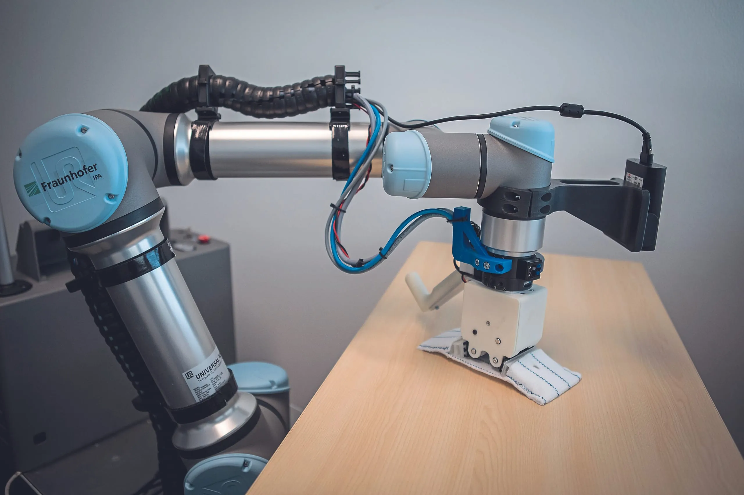 Von diversen betrachteten Möglichkeiten boten Versuche mit einem weichen Kunststoffgreifer die besten Ergebnisse. Man spricht hier auch von einem Greifer mit Fish-Tail-Effekt. Dieser kann im geschlossenen Zustand Türgriffe weitgehend rundherum abwischen. Wenn er geöffnet ist, eignet er sich zum Wischen größerer flacher Oberflächen wie Tische. Da er aus zwei spreizbaren Greiferfingern besteht, könnte er in ­Mikrofasertücher schlüpfen, die hierfür zwei Taschen haben. Die Tücher ließen sich einfach austauschen und reinigen, ähnlich zu dem aktuell vom Reinigungspersonal im Gesundheitswesen verfolgten Ansatz.