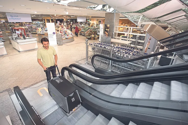 Der Rolltreppenreiniger wird unten an der Rolltreppe aufgesetzt und reinigt dann eine Trittfläche nach der anderen. - © Kärcher